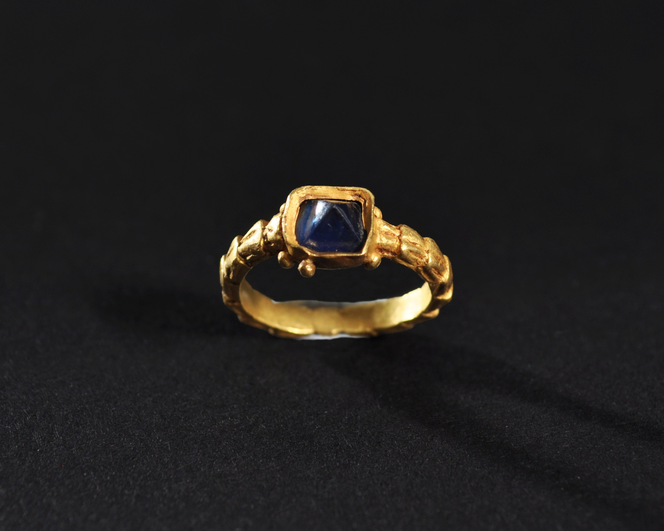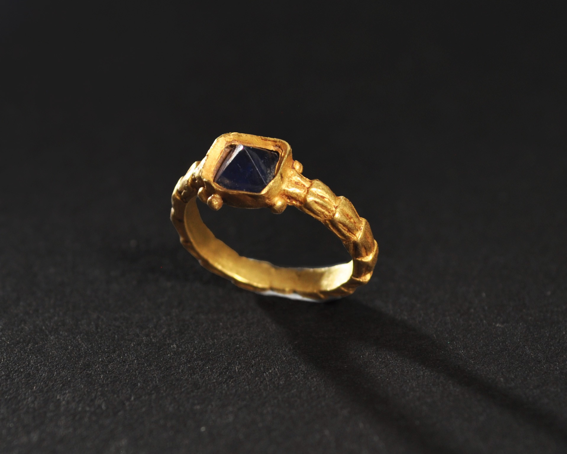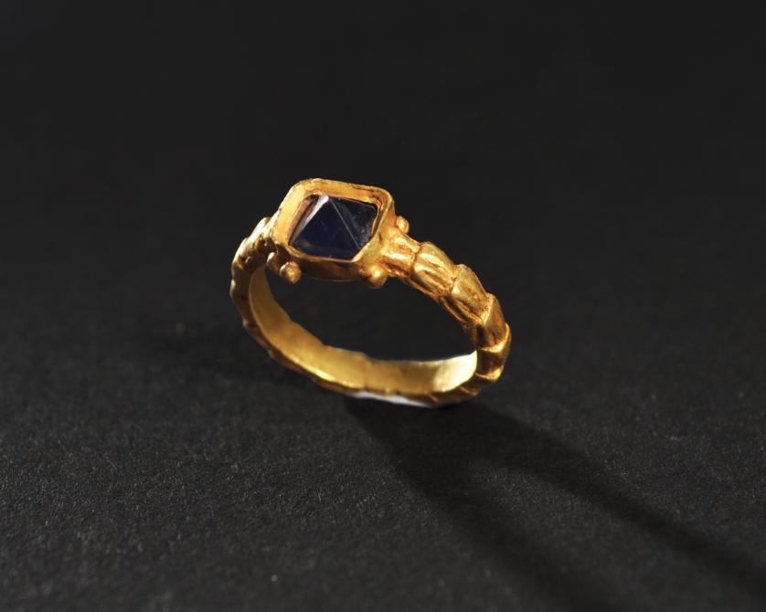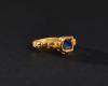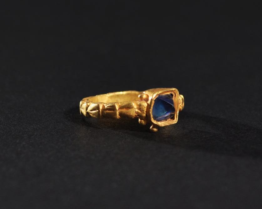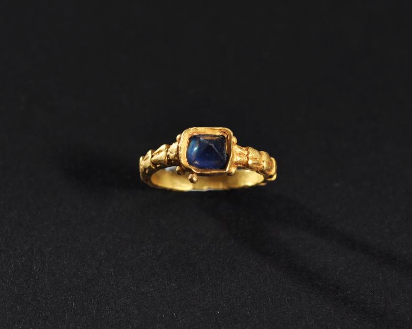 ARQUEOLOGÍA. EDAD MODERNA. Anillo con aro decorado con motivo vegetal y con cazoleta central que alberga una piedra facetada (siglos XVI-XVII). Oro. Diámetro 1,6 cm.