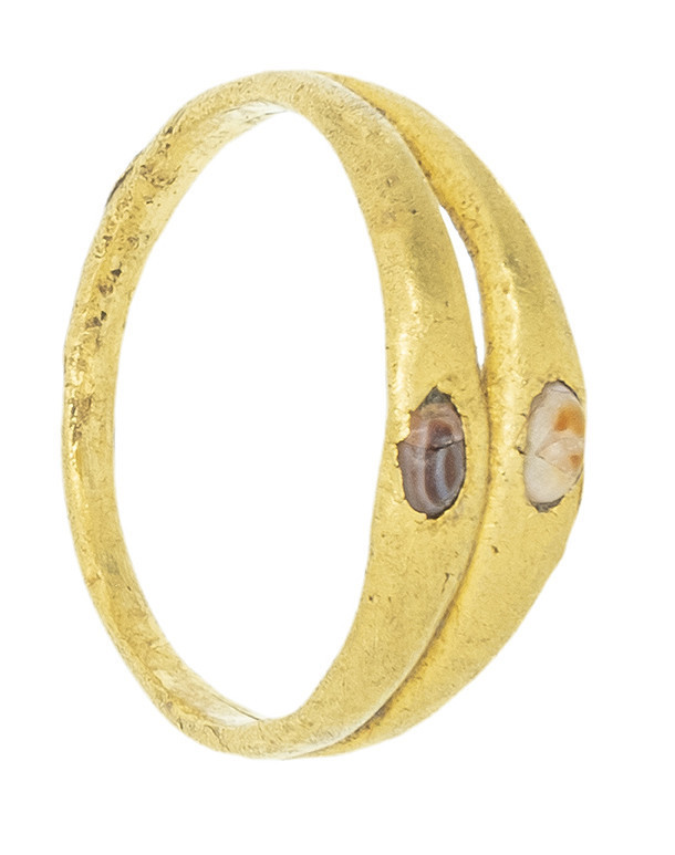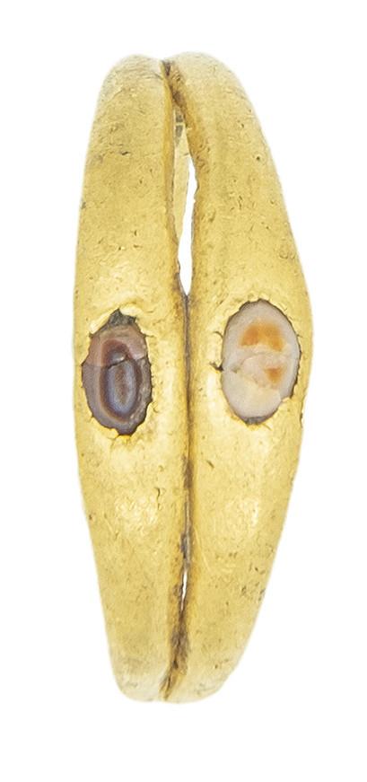 ARQUEOLOGÍA. ROMA. Anillo de aro liso que se bifurca en su parte superior y alberga dos cabujones de ágata bandeada (ss. II-III d.C.). Oro y ágata. Longitud 15,1 mm. Peso 1,68 gr.