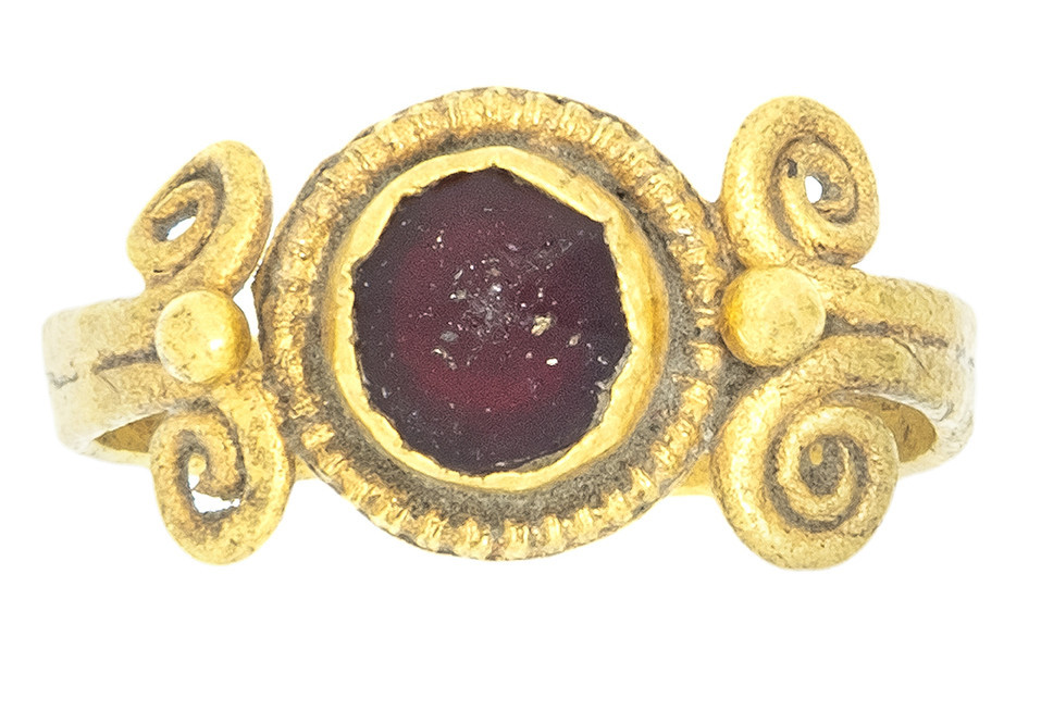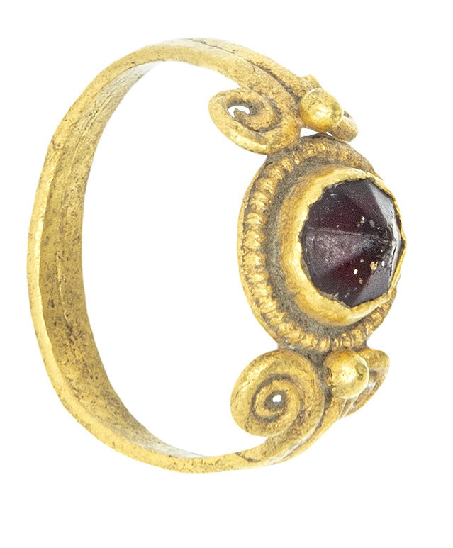 ARQUEOLOGÍA. ROMA. Anillo formado por un aro en pseudo-sogueado que termina en dos volutas con un glóbulo central para unirse a la cazoleta. Esta está ribeteada de glóbulos y alberga un cabujón apuntado (siglo III d.C. o posterior). Oro y granate almandino. Longitud 17 mm. Peso 2,41 gr.
