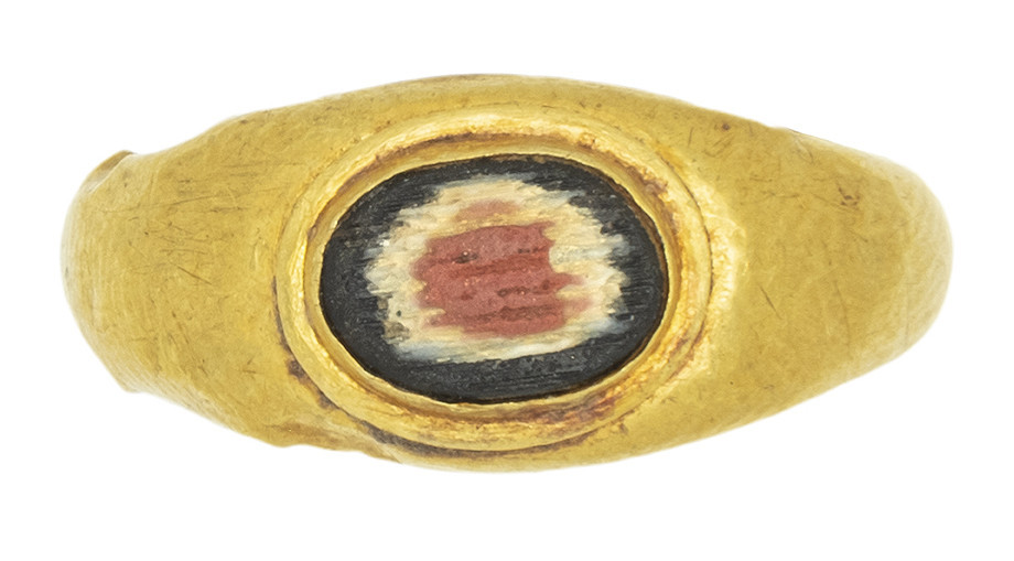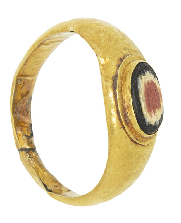 ARQUEOLOGÍA. ROMA. Anillo de aro liso con un engaste de pasta vítrea que imita un ágata ojo (¿ss. I-III d.C.?). Oro y pasta vítrea. Longitud 18,8 mm. Peso 1,09 gr.