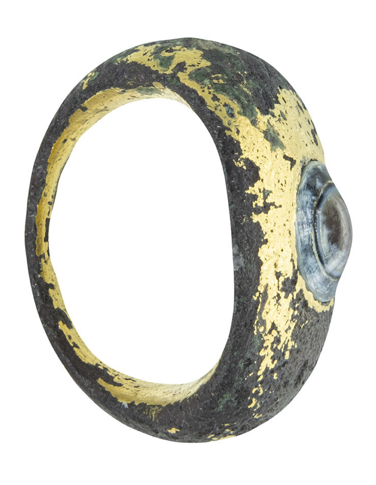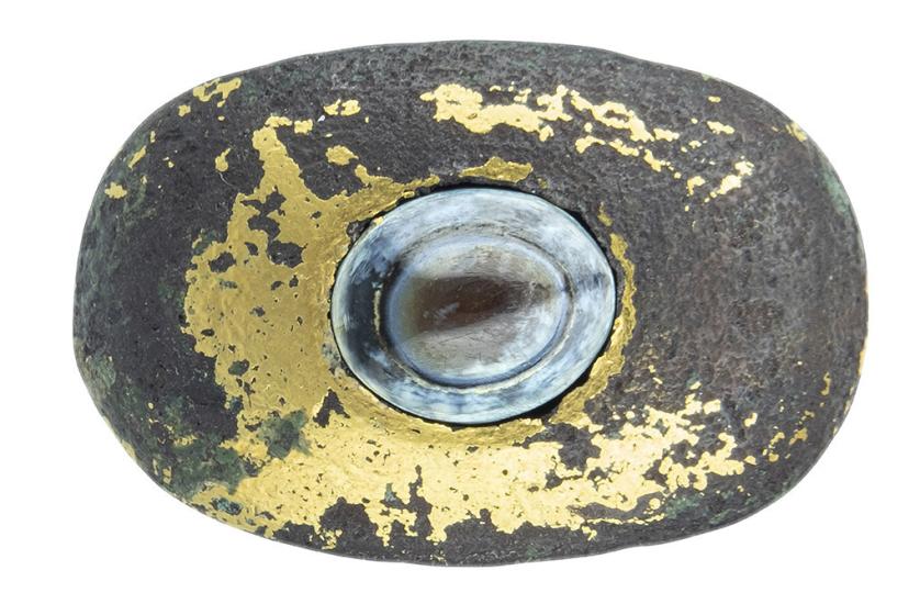 ARQUEOLOGÍA. ROMA. Anillo con una pequeña piedra tricolor engastada (siglo III d.C.). Cobre bañado en oro y ágata. Longitud 28,6 mm. Peso 19,67 gr.