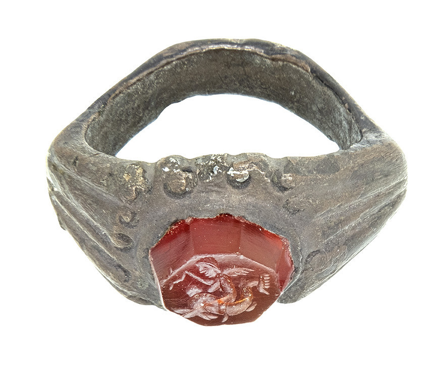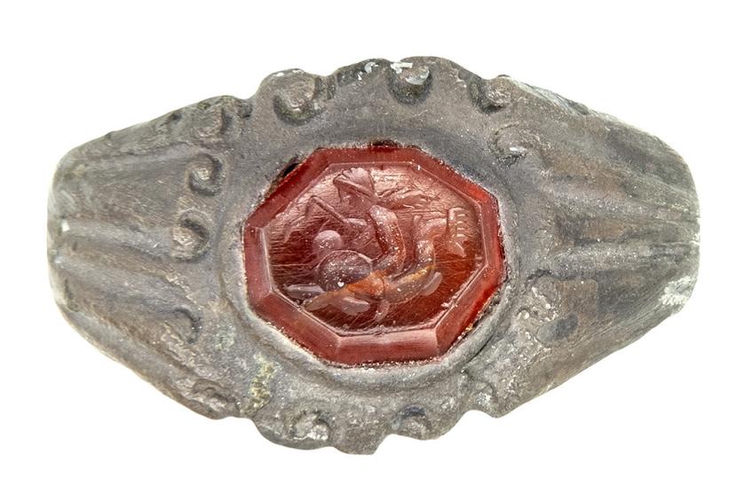 ARQUEOLOGÍA. ROMA. Anillo con entalle octogonal con representación de un amorcillo cabalgando un delfín y aro con decoración acanalada en abanico rematada en volutas (siglo III d.C.). Plata y carneola. Longitud 25,7 mm. Peso 11,5 gr.