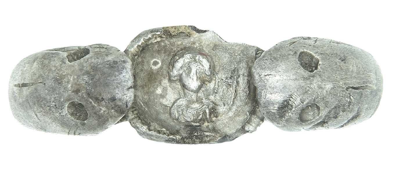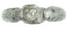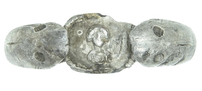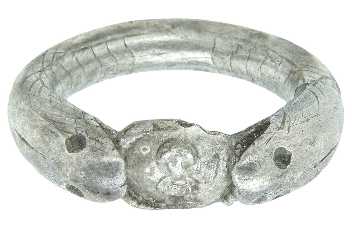 ARQUEOLOGÍA. ROMA. Anillo formado por un aro en forma de serpiente con dos cabezas, que sujetan con sus bocas un chatón ovalado con un busto frontal en relieve de Apolo con su lira (¿ss. I-II d.C.?). Plata. Longitud 26 mm. Peso 9,24 gr.