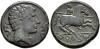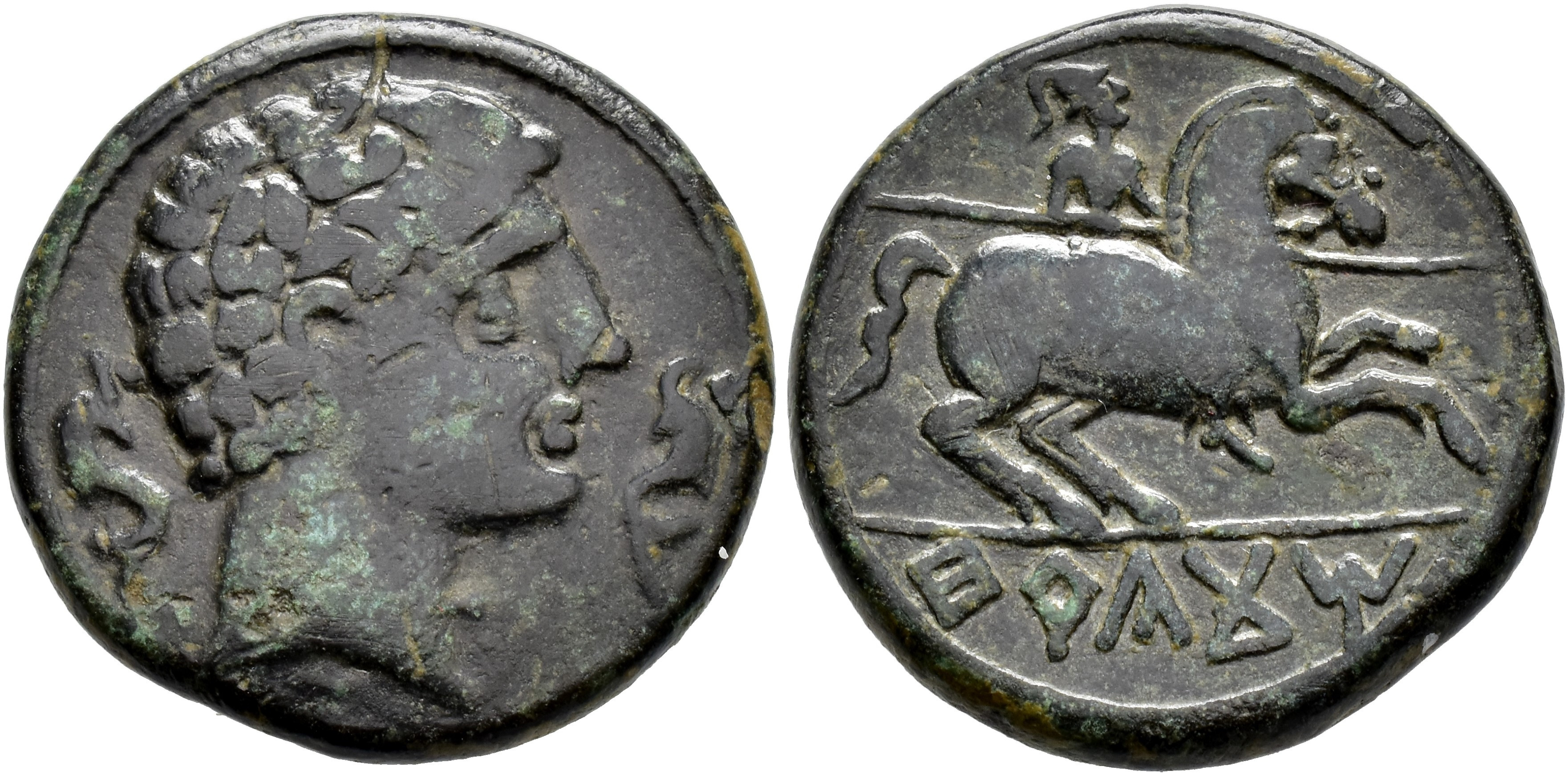 HISPANIA ANTIGUA. TERKAKOM. Unidad. A/ Cabeza masculina con collar a der. entre dos delfines. R/ Jinete lancero a der., en exergo TeRKaKoM. AE 9,72 g. 23,9 mm. I-2386; ACIP-1520. Pátina verde oscuro. Pequeñas marcas. MBC-. Rara.