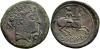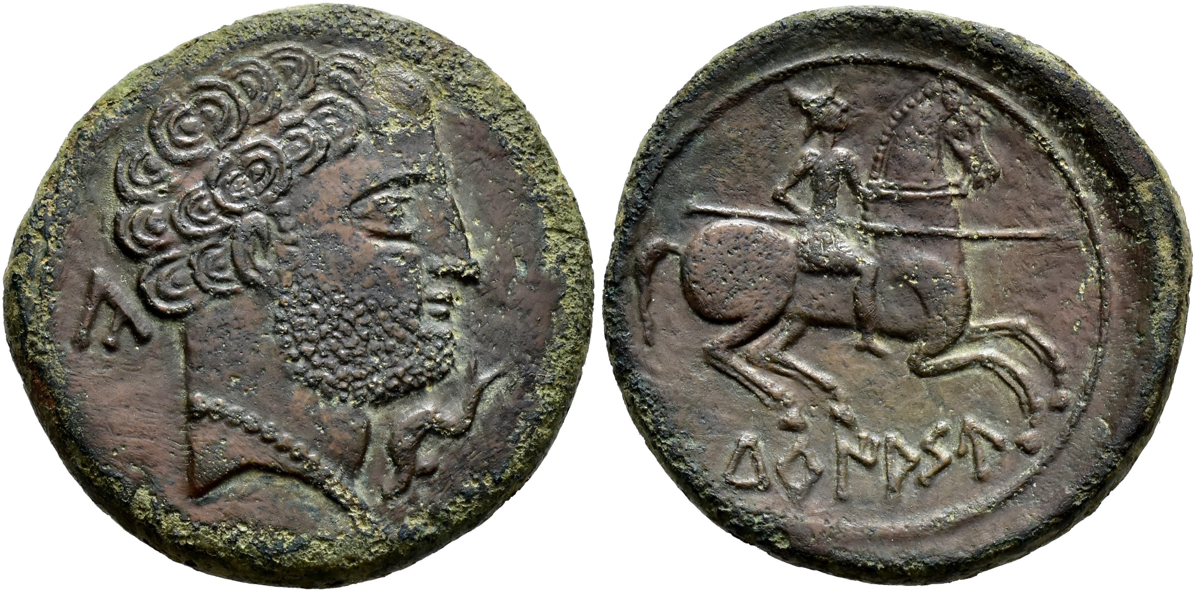 HISPANIA ANTIGUA. TURIASU. Unidad. A/ Cabeza barbada a der., delante, delfín y detrás signo ibérico Ka. R/ Jinete lancero a der., debajo sobre línea, TuRIASU. AE 12,37 g. 27,2 mm. I-2424 var. con línea en rev.; ACIP-1708. Campos repasados. Pátina oscura. EBC-/MBC+.