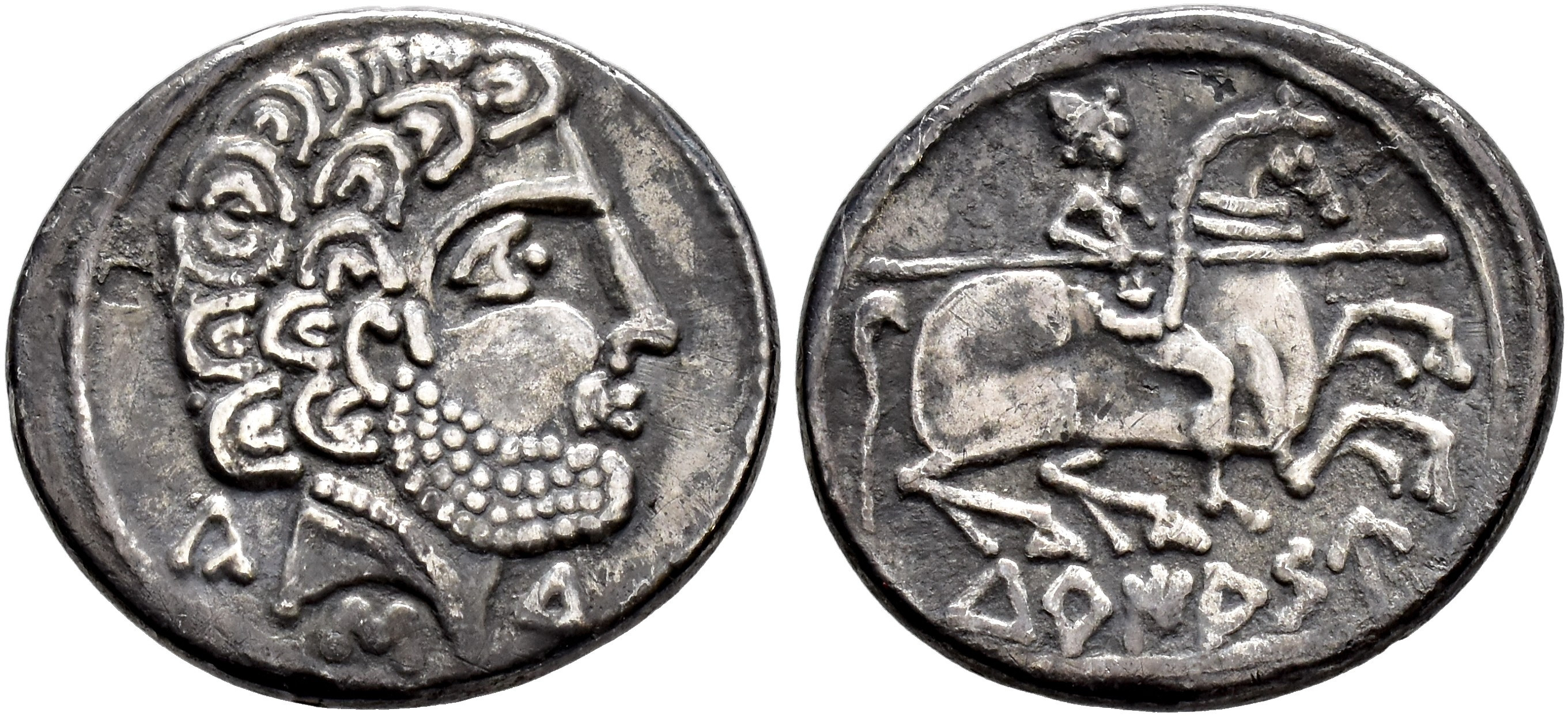 HISPANIA ANTIGUA. TURIASU. Denario. A/ Cabeza masculina a der.; Ka-S-Tu. R/ Jinete con lanza a der., patas del caballo por encima de la ley. TuRIASU, sobre línea. AR 3,15 g. 18,4 mm. I-2417; ACIP-1721.  Punzón en anv. MBC. Escasa.