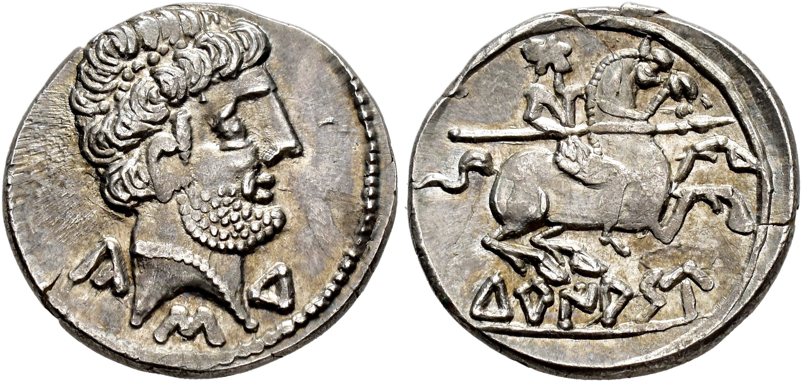HISPANIA ANTIGUA. TURIASU. Denario. A/ Cabeza masculina con collar a der.; alrededor signos ibéricos Ka-S -Tu. R/ Jinete lancero a der., debajo sobre línea TuRIASU. AR 3,68 g. 18,4 mm. I-2412; ACIP-1722. Hojita en anv. EBC-.