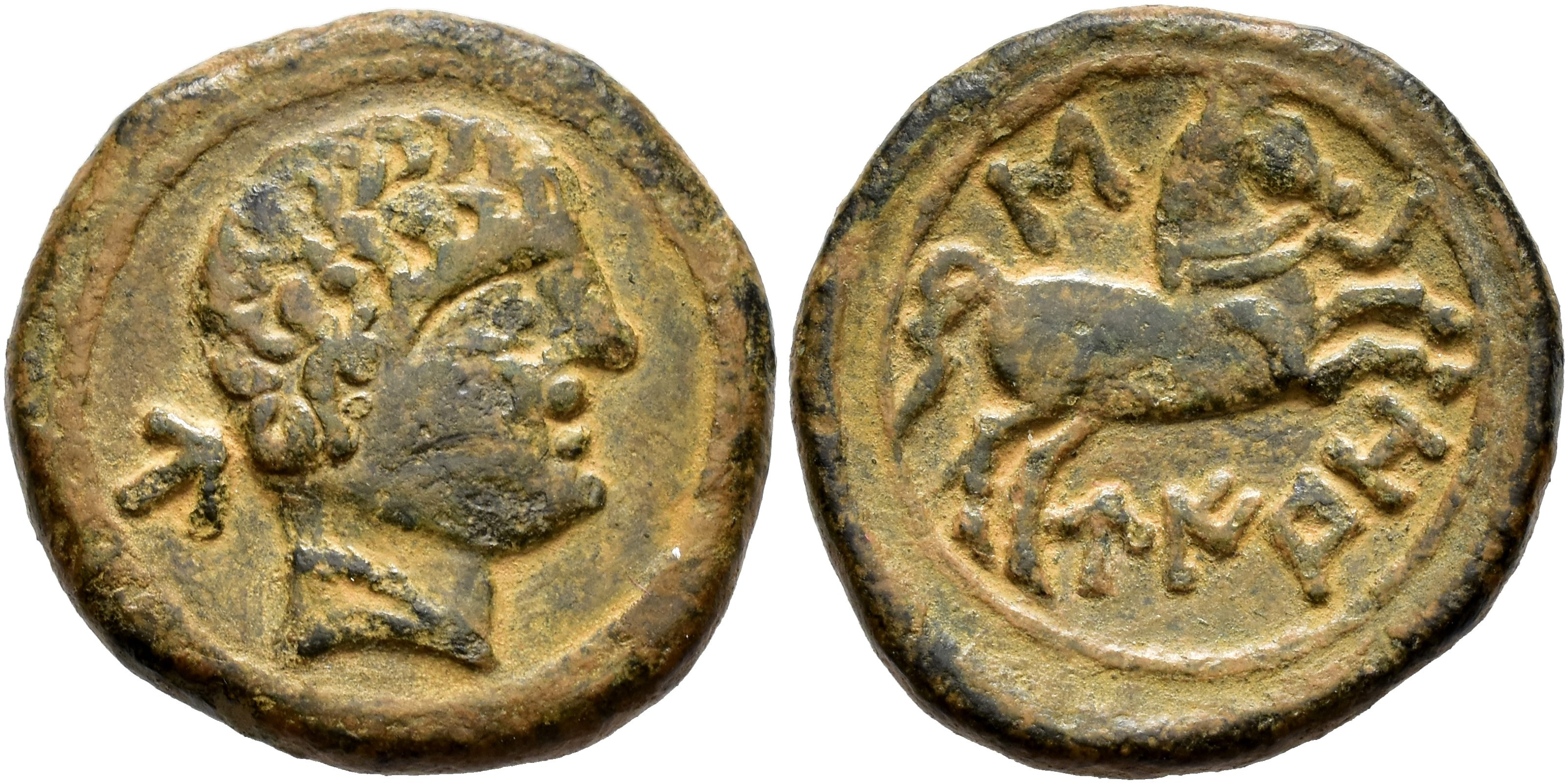 HISPANIA ANTIGUA. UIROUIAS. Mitad. A/ Cabeza masculina con collar a der., detrás U. R/ Caballo galopando a der., encima S ibérica, debajo UIRO. AE 7,13 g. 21,8 mm. I-2487; ACIP-1921. MBC. Rara.