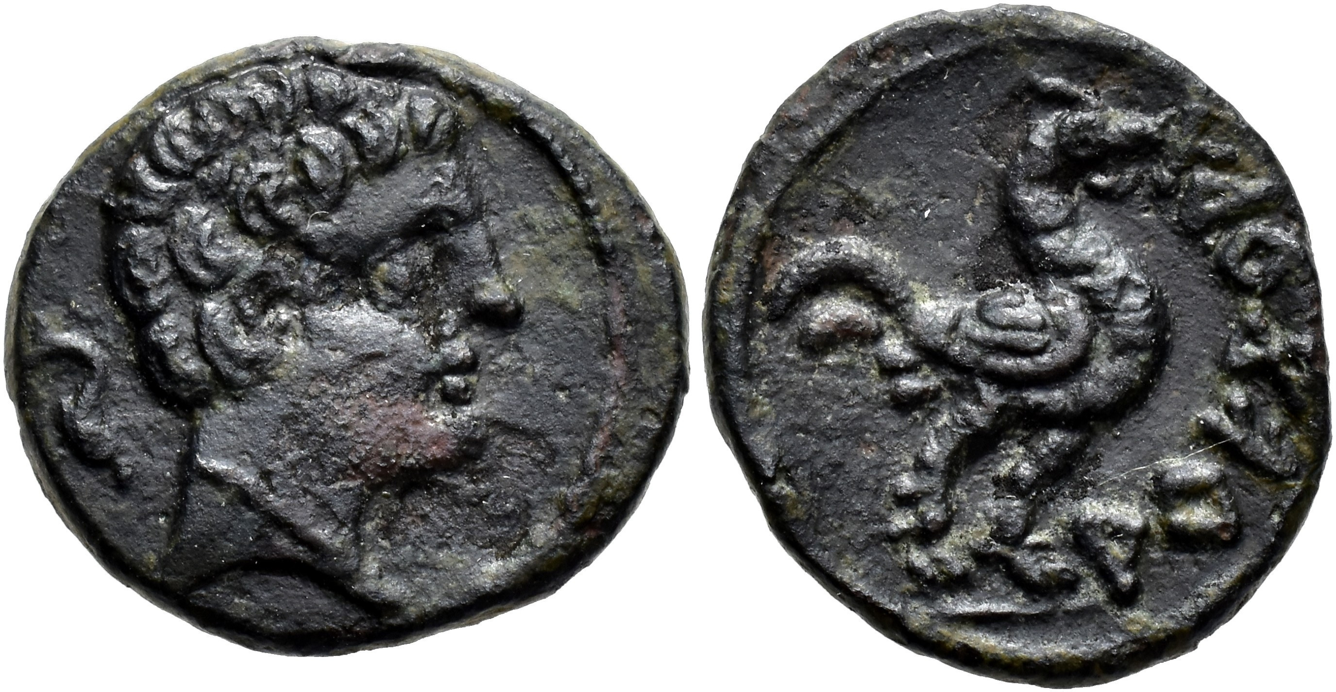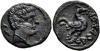 HISPANIA ANTIGUA. AREKORATA. Semis. A/ Cabeza masculina a der., detrás, delfín. R/ Gallo a der.; AREKoRATa. AE 3,97 g. 19,4 mm. I-92; ACIP-1779. Erosiones en anv. Pátina oscura. MBC+. Rara.