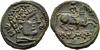 HISPANIA ANTIGUA. USAMUS. Unidad. A/ Cabeza masculina con collar a der., delante delfín, detrás US. R/ Jinete lancero a der., exergo USAMUS. AE 8,46 g. 24,5 mm. I-2508; ACIP-1925. Cospel falto. Pátina marrón verdoso. EBC-. Rara.
