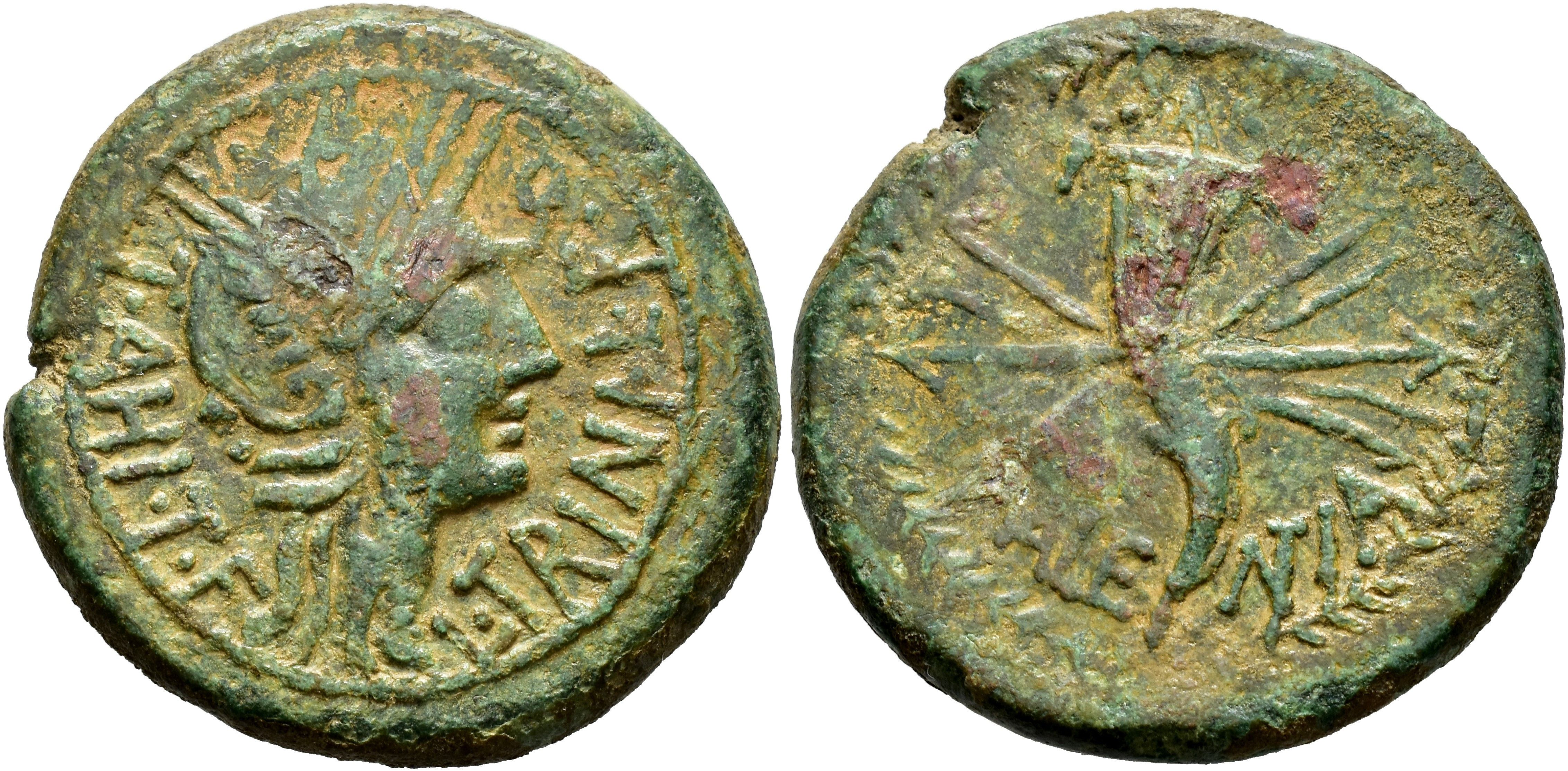 HISPANIA ANTIGUA. VALENTIA. As. A/ Cabeza de Roma a der.; T AHI TF L TRINI L F Q. R/ Cornucopia con haz de rayos; VALE-NTIA. AE 19,62 g. 30,7 mm. I-2512; ACIP-2052.  Pequeñas erosiones. Pátina verde. MBC-.