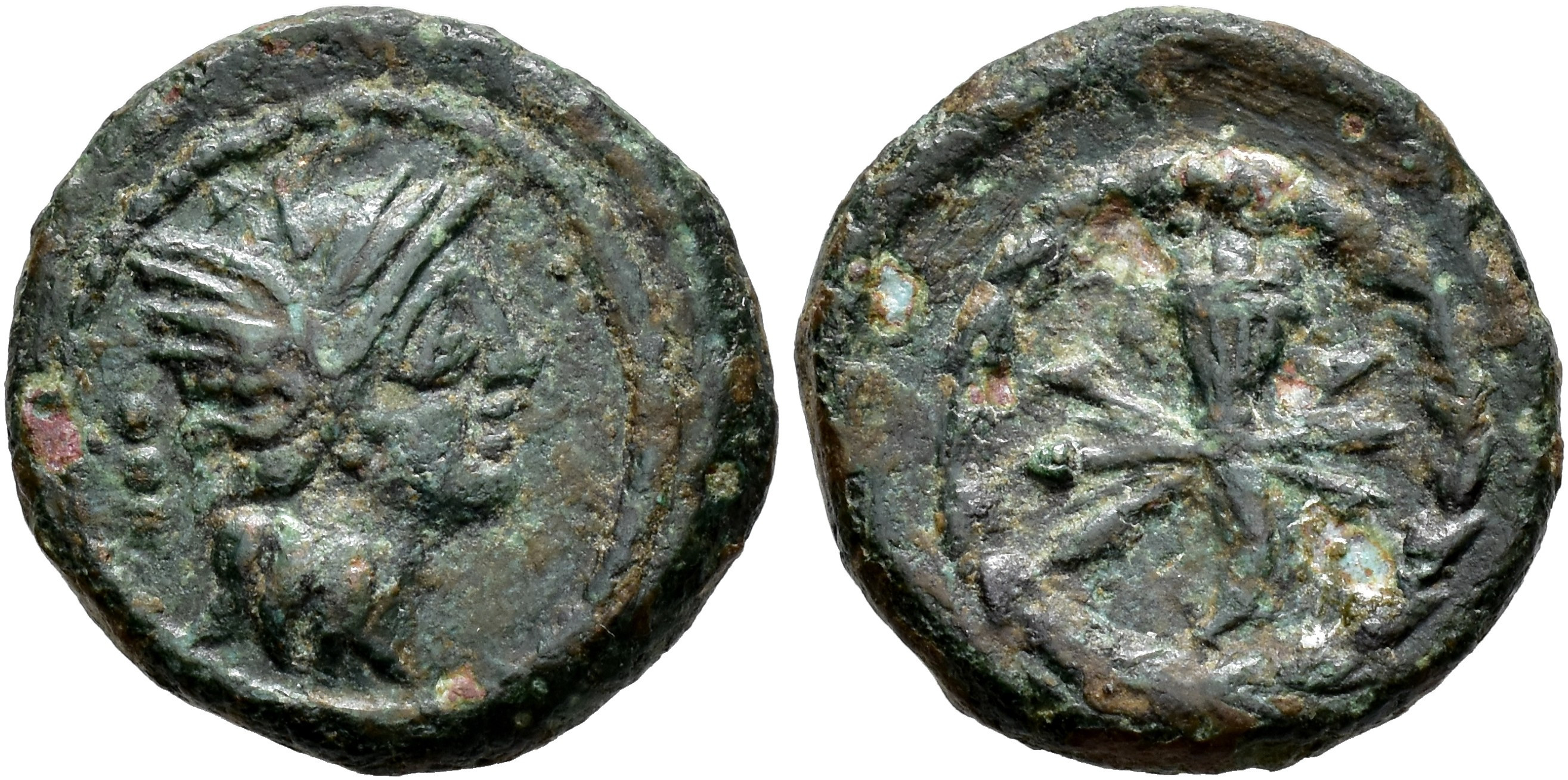 HISPANIA ANTIGUA. VALENTIA. Cuadrante. A/ Cabeza de Roma a der., detrás 3 glóbulos. R/ Cornucopia sobre haz de rayos. AE 4,47 g. 17,9 mm. I-2515; ACIP-2056. Pequeñas erosiones. Pátina verde. MBC/BC+. Rara.