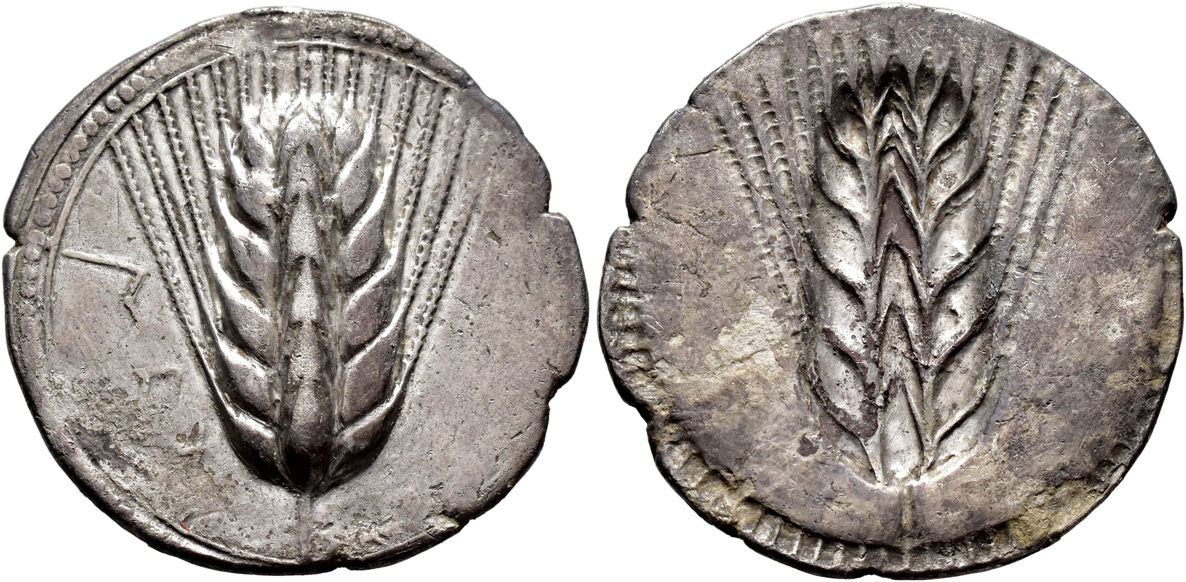 GRECIA ANTIGUA. LUCANIA. Metaponto. Estátera (ss. VI-V a.C.). A/ Espiga, a izq. MET. R/ Anv. incuso. 7,65 g. 27,6 mm. COP-1158 ss. Pequeñas marcas. MBC.