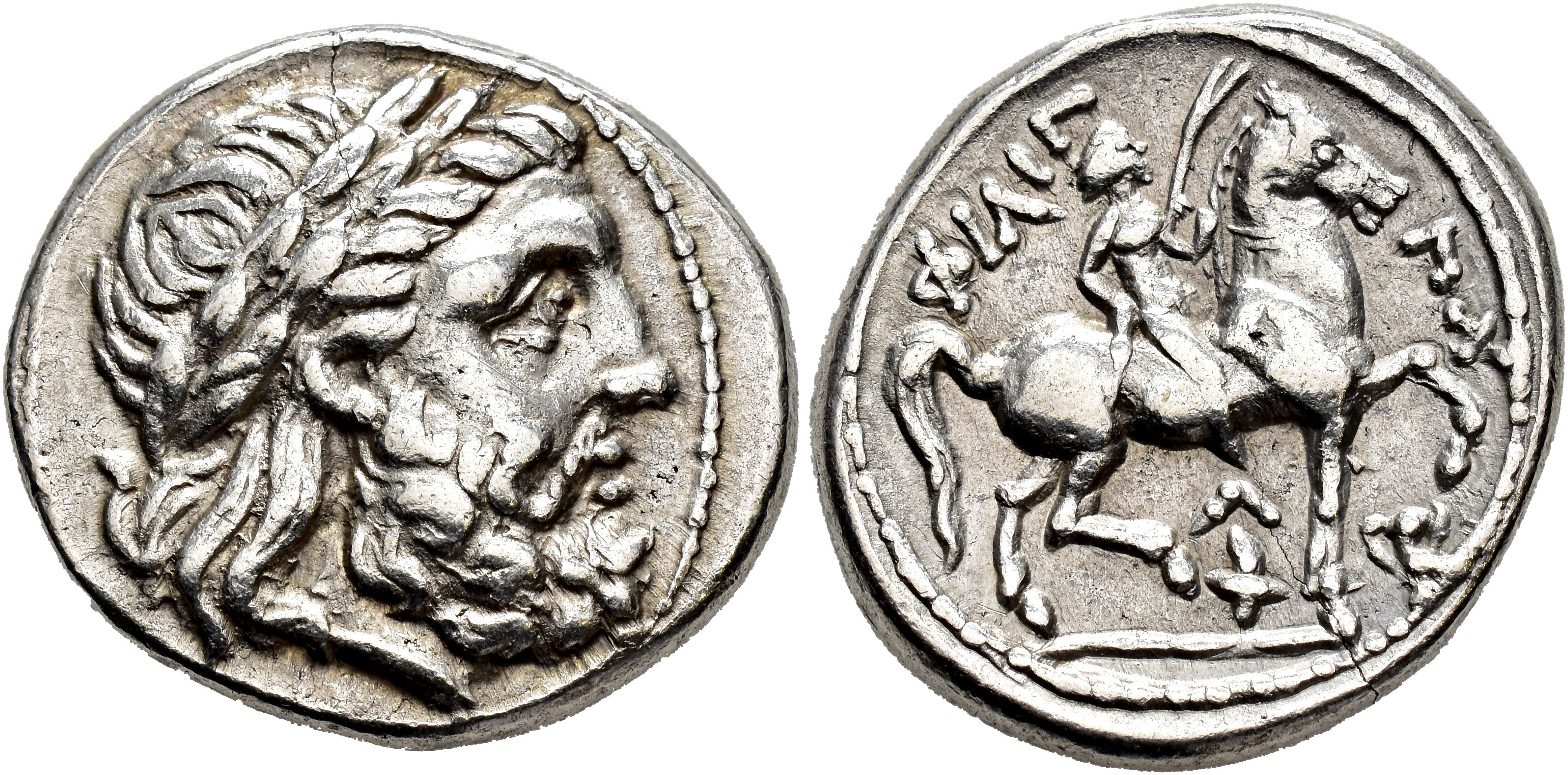 GRECIA ANTIGUA. MACEDONIA. Filipo II. Anfípolis. Tetradracma (c. 315-295/4 a.C.). A/ Cabeza de Zeus laureada a der. R/ Jinete con palma a der., debajo lambda y antorcha, delante crátera. AR 14,09 g. 25,5 mm. Le Rider-pl. 47, 27. MBC+/MBC.