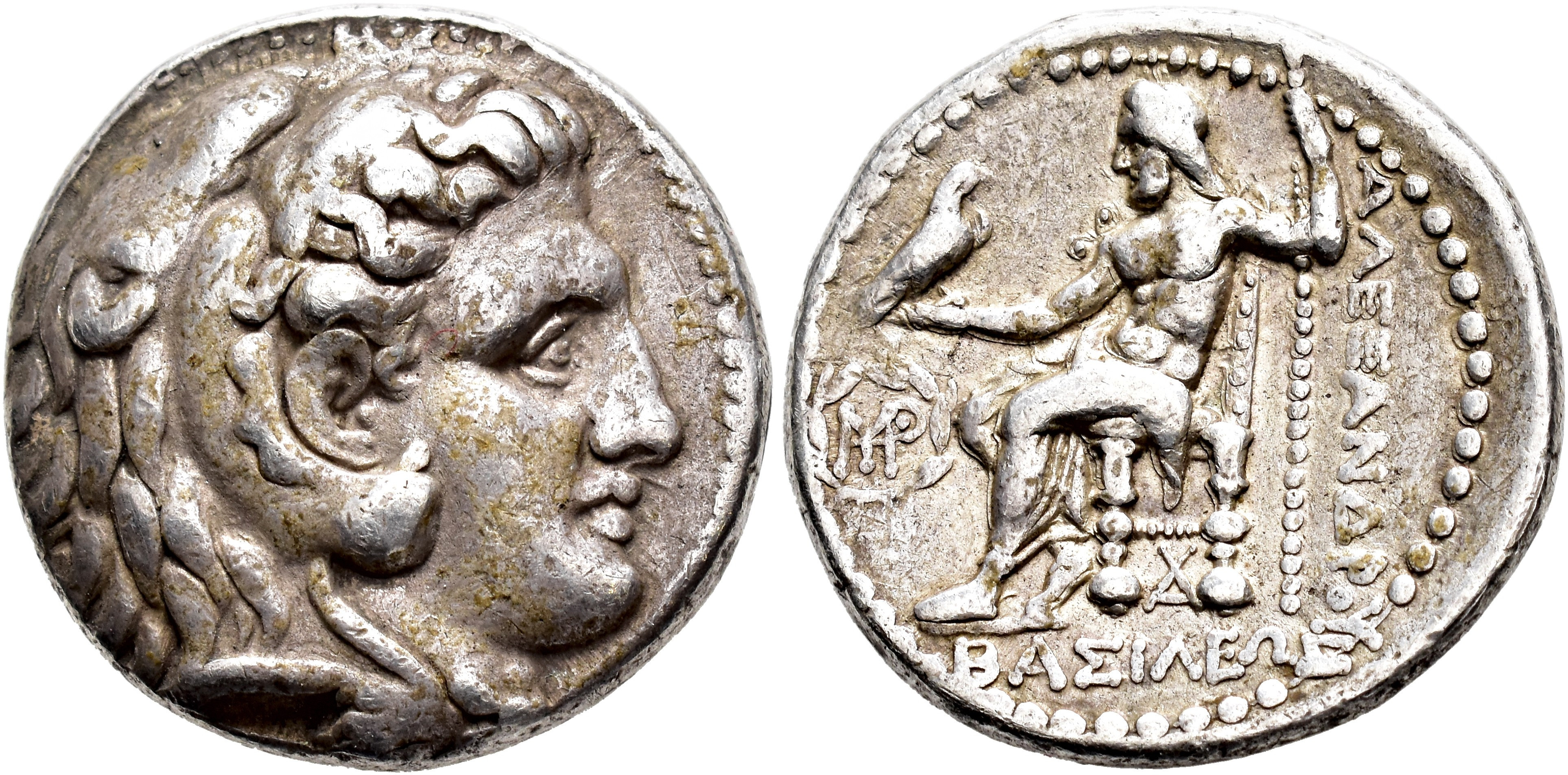 GRECIA ANTIGUA. MACEDONIA. A nombre de Alejandro III. Babilonia. Tetradracma (317-311 a.C.). A/ Cabeza de Alejandro/Herakles con leonté a der. R/ Zeus entronizado a izq., debajo del trono monograma, delante monograma dentro de láurea. AR 16,86 g. 26,4 mm. Price-3722. MBC.