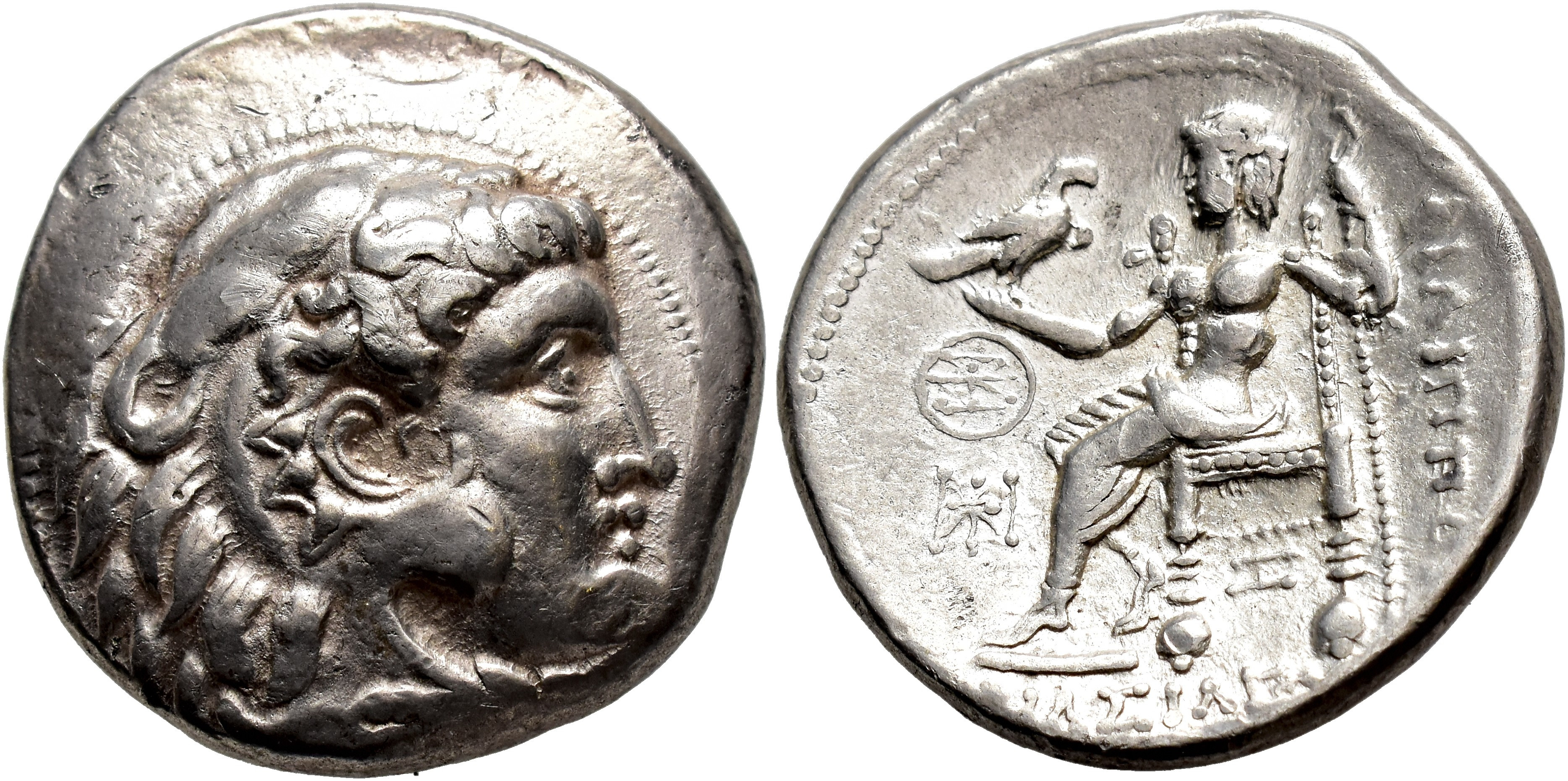 GRECIA ANTIGUA. MACEDONIA. Filipo III. Aradus. Tetradracma (c. 323-c. 316 a.C.). Delante del trono dos monogramas, debajo zeta. 16,45 g. 25,8 mm. Price-P.151. Anv. algo descentrado. MBC+.