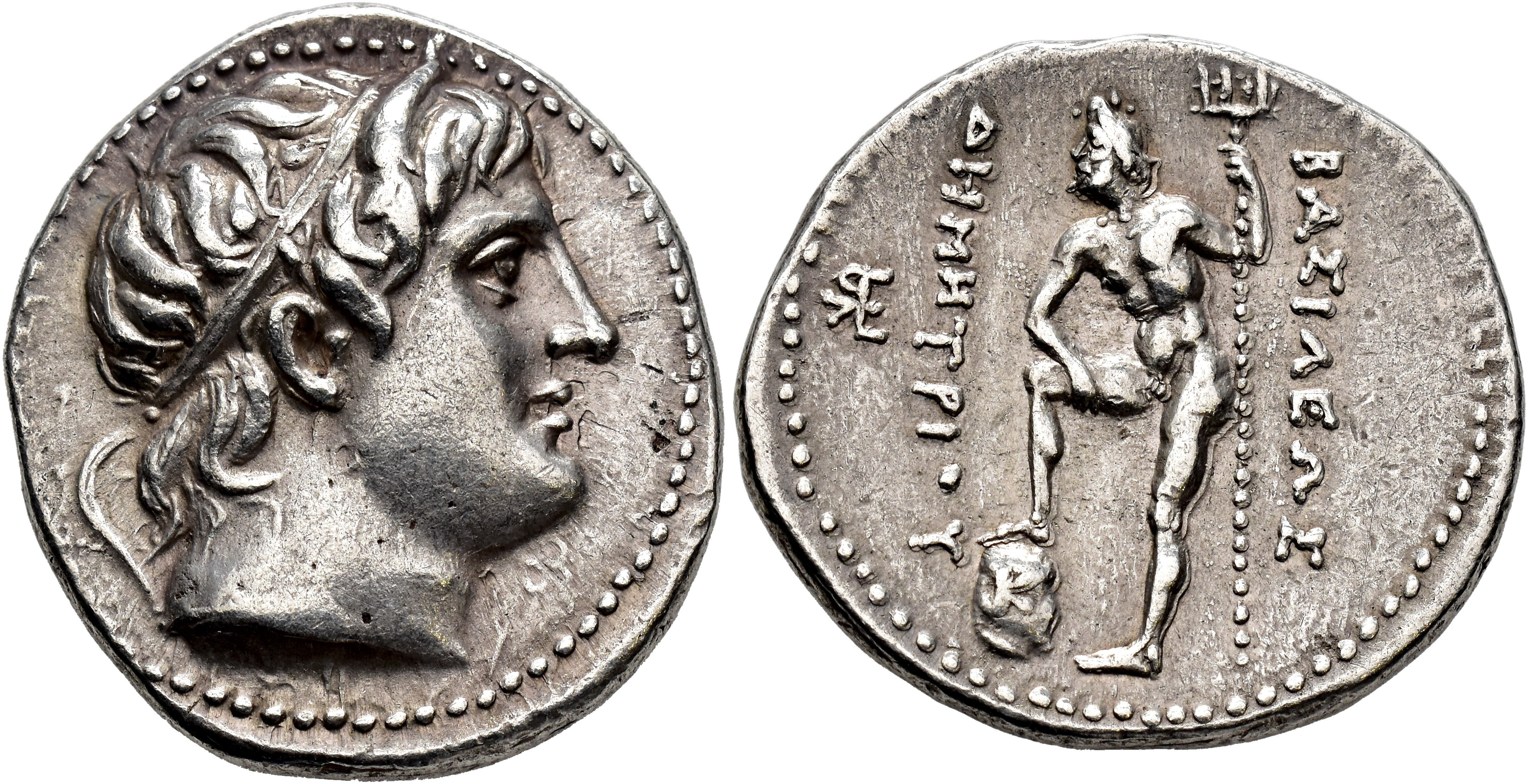 GRECIA ANTIGUA. MACEDONIA. Demetrio. Tetradracma (306-283 a.C.). A/ Cabeza diademada y con cuernos a der. R/ Poseidón a izq. con tridente y pie sobre roca, en campo a izq. monograma. AR 17,14 g. 30,6 mm. COP-1179, var. monograma. MBC+.