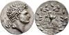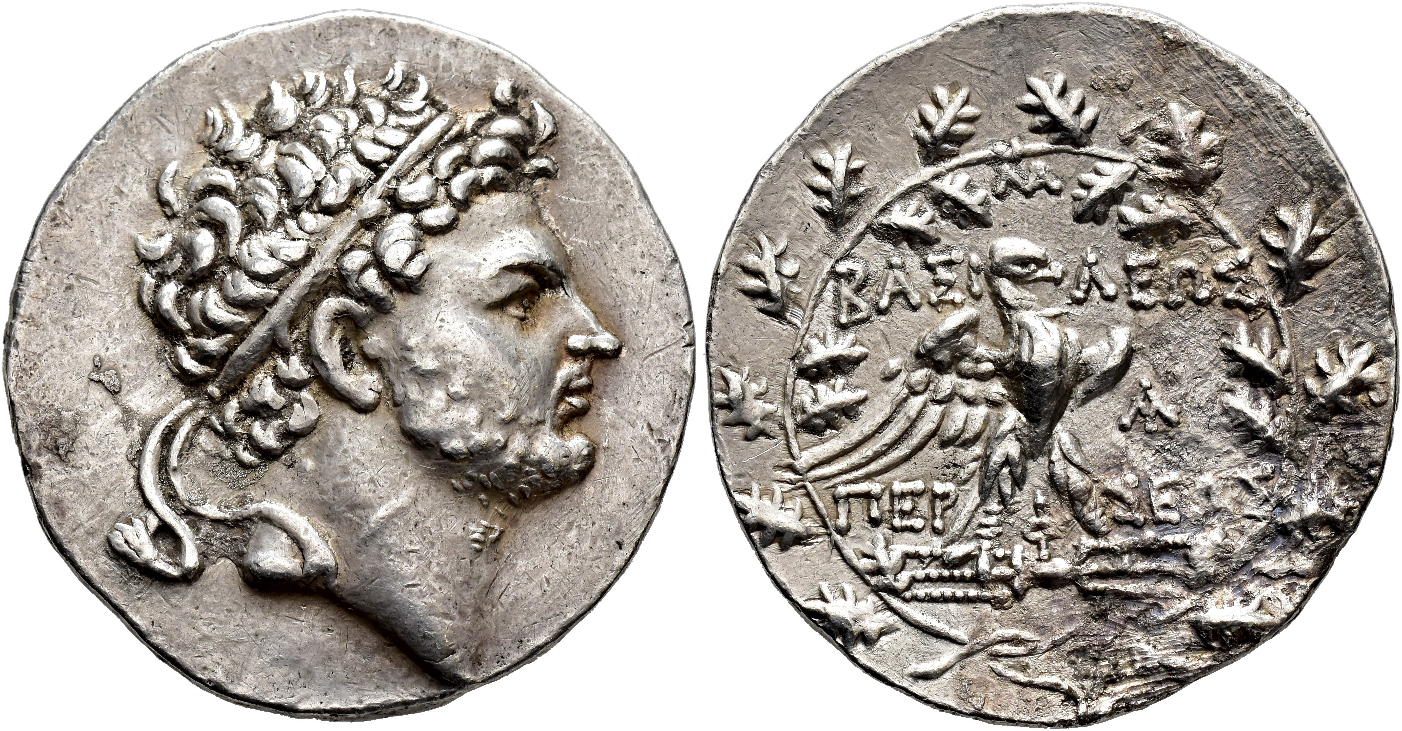 GRECIA ANTIGUA. MACEDONIA. Perseo. Tetradracma (178-168 a.C.). A/ Cabeza diademada a der. R/ Águila sobre haz de rayos a der. dentro de corona de roble, encima y debajo monogramas; debajo F; BASILEWS/PERSEWS. AR 14,85 g. 32,7 mm. COP-1269, var. monograma. Pequeña concreción en rev. MBC+.