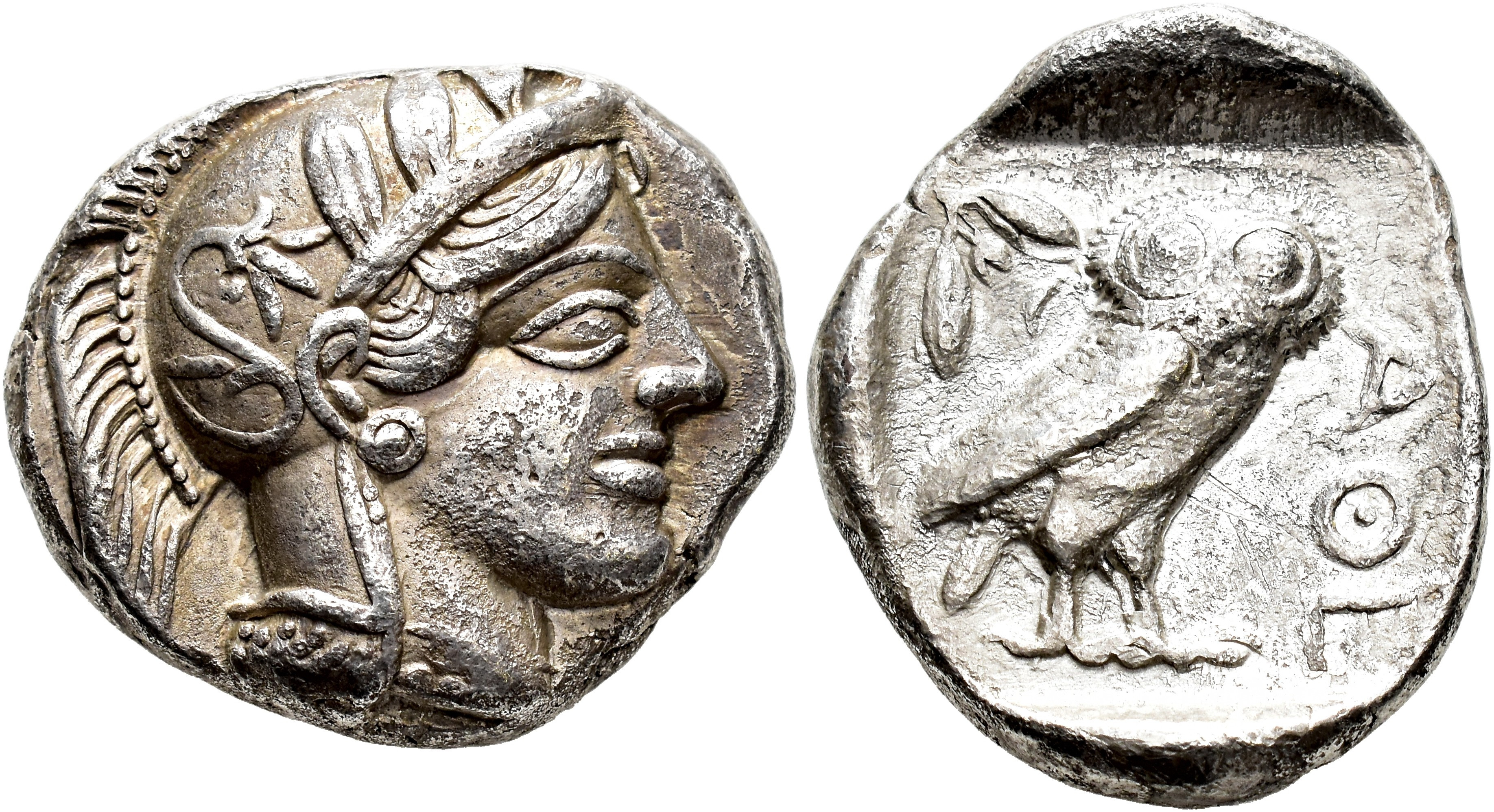 GRECIA ANTIGUA. ÁTICA. Atenas. Tetradracma (454-404 a.C.). A/ Cabeza de Atenea a der. R/ Lechuza a der. mirando de frente; detrás creciente y rama de olivo, delante ley. griega AQE, todo dentro de cuadrado incuso. AR 16,7 g. 26,5 mm. COP-31 ss.; SBG-2526. MBC+/MBC-.