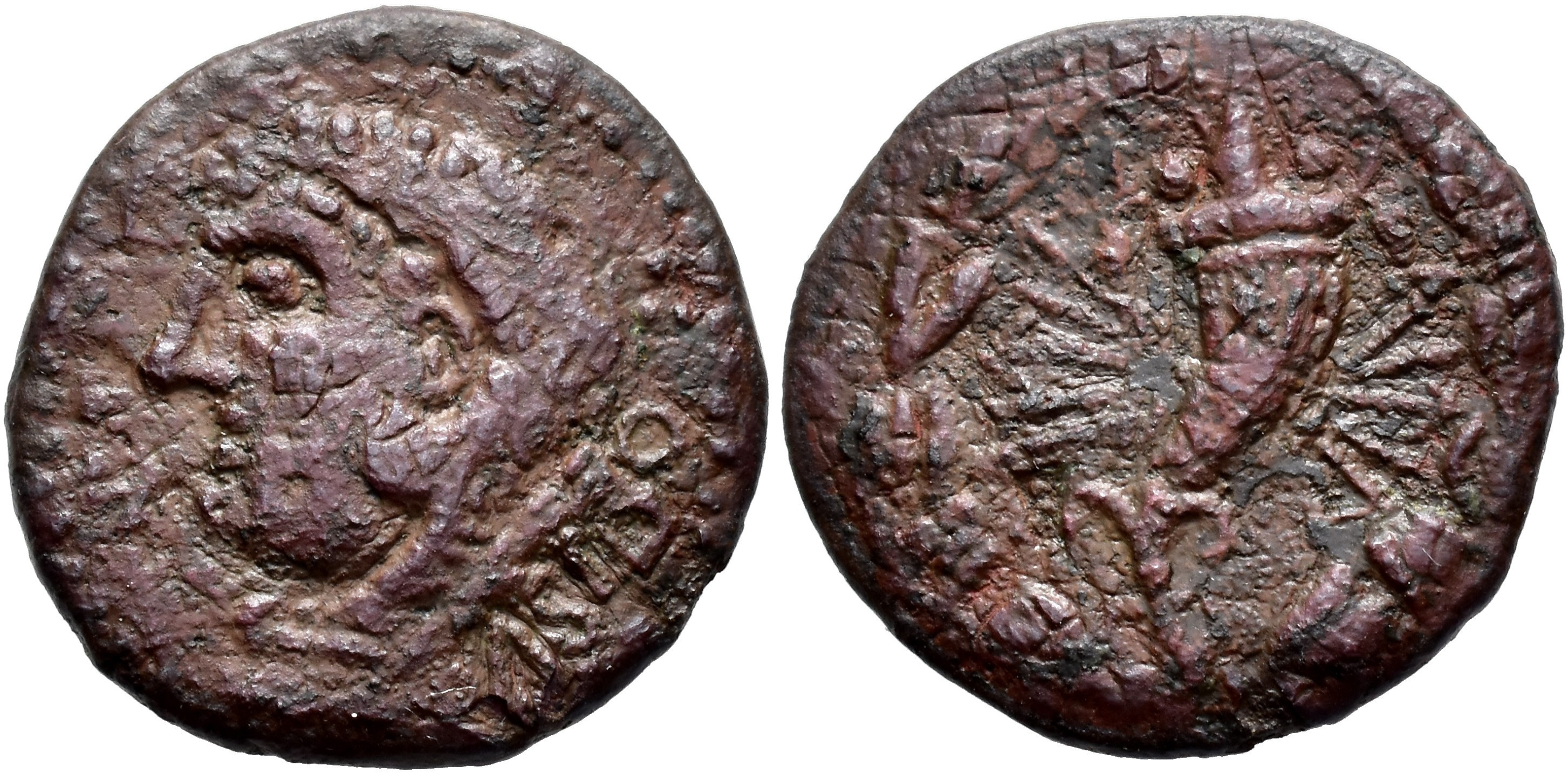 HISPANIA ANTIGUA. ASIDO. Semis. A/ Cabeza de Melkart con leonté a izq., detrás ASIDO. R/ Cornucopia con rayos, alrededor láurea. AE 4,08 g. 19,9 mm. I-154; ACIP-922; CC-658, mismo ejemplar. Pátina marrón rugosa. MBC. Rarísima.