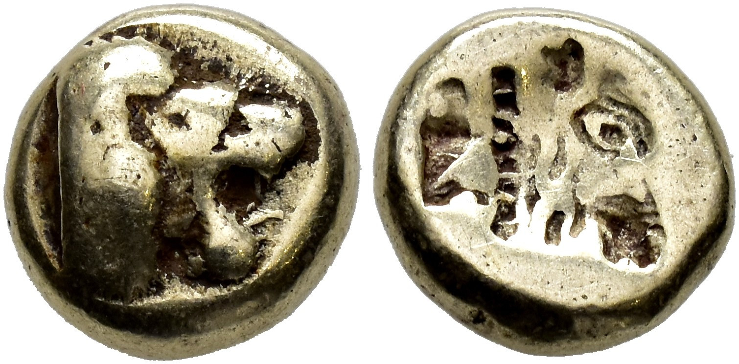 GRECIA ANTIGUA. LESBOS. Hekte (c. 480-440 a.C.). A/ Cabeza de león a der. R/ Cabeza de ternera incusa. EL 2,44 g. 10,2 mm. COP-301. BC+.