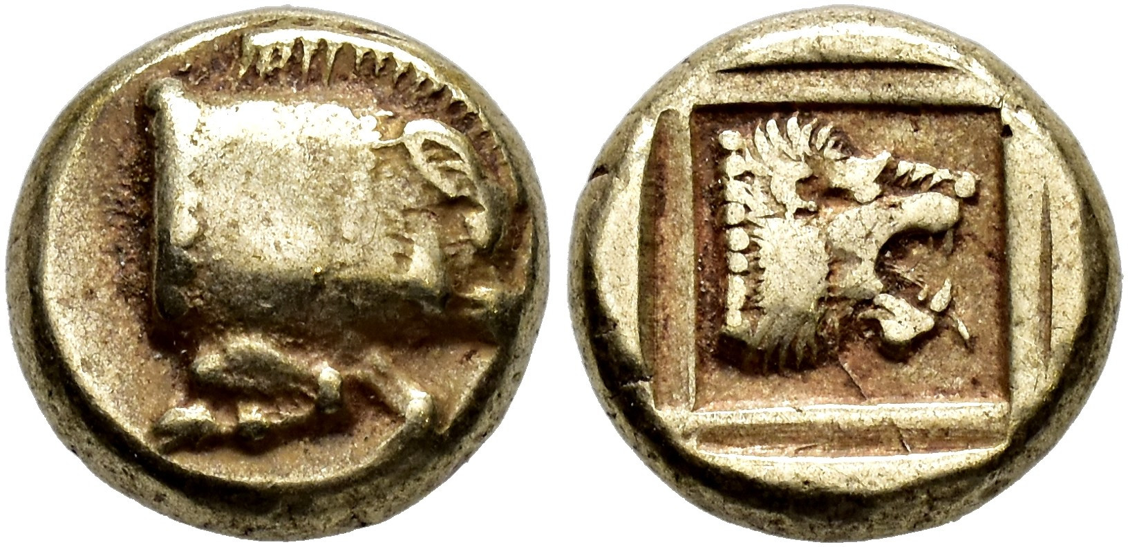 GRECIA ANTIGUA. LESBOS. Hekte (c. 480-440 a.C.). A/ Prótomo de jabalí a der. R/ Cabeza de león a der. en gráfila lineal dentro de cuadrado incuso. EL 2,53 g. 10,7 mm. COP-309. MBC-.
