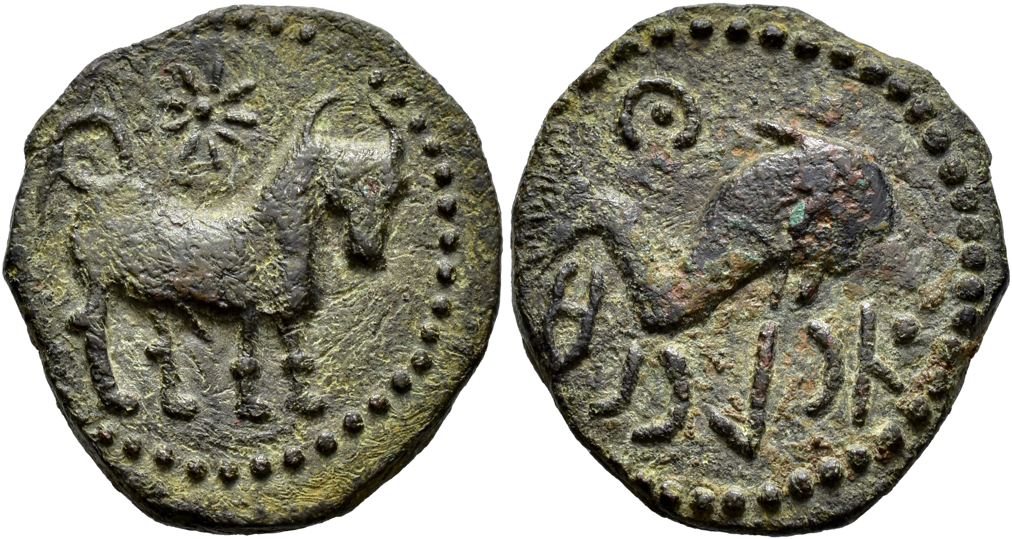 HISPANIA ANTIGUA. ASIDO. Semis. A/ Toro a der., encima estrella. R/ Delfín a der., encima creciente con punto; `sdn bl. AE 8,04 g. 25 mm. I-158; ACIP-914. MBC+.