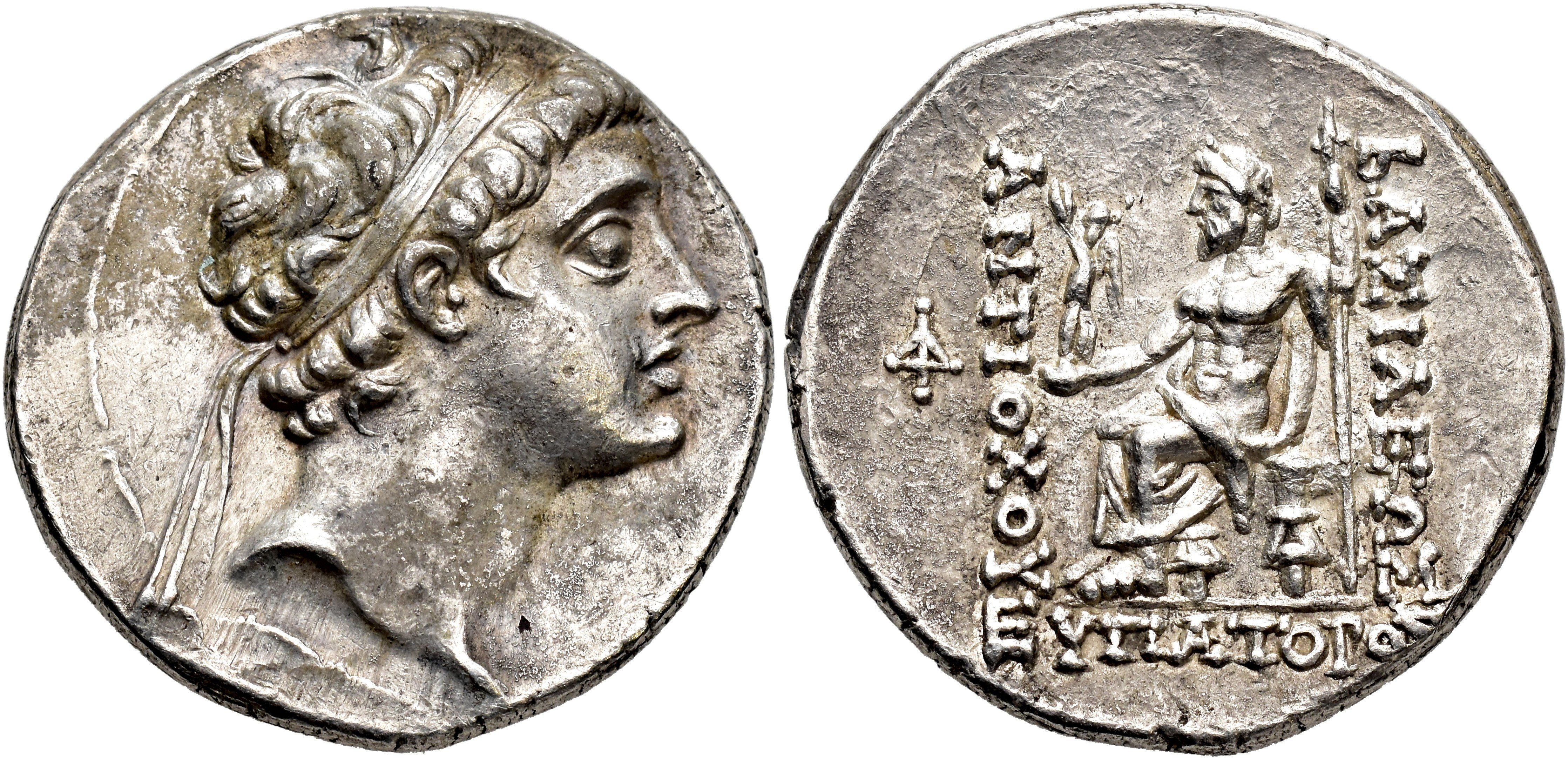 GRECIA ANTIGUA. REYES SELÉUCIDAS. Antíoco V. Tetradracma (164-162 a.C.). A/ Cabeza diademada a der. R/ Zeus entronizado a izq. con cetro y Niké, a izq. monograma. AR 16,7 g. 29,6 mm. Seleuc.-II.1575.1. EBC-.