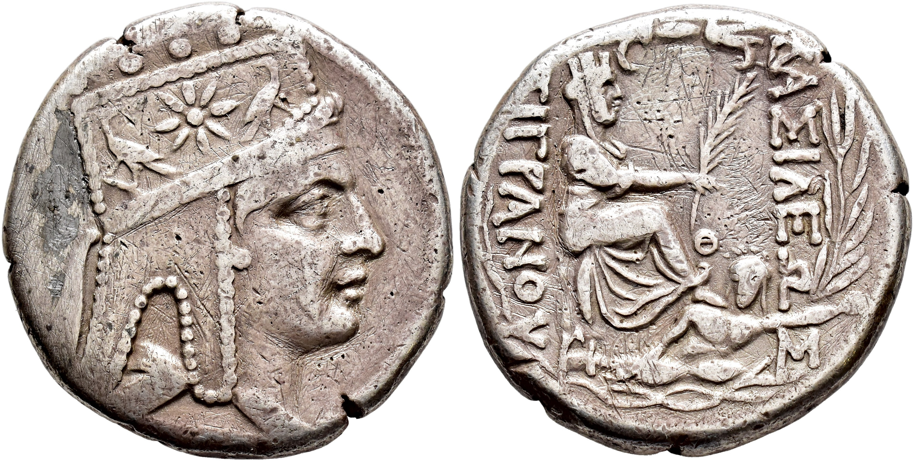 GRECIA ANTIGUA. REYES DE ARMENIA. Tigranes II. Tetradracma (c. 70-69 a. C.). A/ Cabeza con tiara a der. R/ Tyche velada y torreada sentada sobre rocas a der., con el Orontes a sus pies, en campo Q y monograma entre las rocas.  AR 14,13 g. 26,6 mm. SBG-7202 var. Rayas. MBC. Escasa.