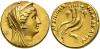 NumismáticaArsinoe era hija de Ptolomeo I, casó en primer lugar con el rey Lisímaco de Tracia, y luego con su medio hermano Ptolomeo Keraunos, que fue brevemente rey de Macedonia, con quien tuvo una tormentosa relación que le llevó a pedir la protección de su hermano Ptolomeo II, donde parece ser que intrigó para que se condenara y exiliara a su esposa, Arsinoe I, y así ambos hermanos se casaron, por lo que se les dio el epíteto de Filadelfos. Ambos se convirtieron en la Gran Pareja Real, siguiendo los modelos del Egipto faraónico, y teniendo un papel relevante en la política, la religión y la cultura, según algunas fuentes ganó varias carreras de cuadrigas en los Juegos Olímpicos. Murió hacia 268 y su esposo la deificó y estableció un muy importante culto especial para ella como Arsinoe Filadelfo, siendo sus atributos divinos un pequeño cuerno de carnero en su oreja (que la relaciona con el carnero divino de Mendes) y un par de cornucopias. Tras su matrimonio, en 272, Ptolomeo II creó una nueva moneda de oro aún de mayor tamaño, el mnaieion (octodracma) con un valor de 100 dracmas de plata (1 mina) y aquí tenemos un magnífico ejemplar donde aparece Arsinoe II deificada con sus atributos divinos y su nombre.