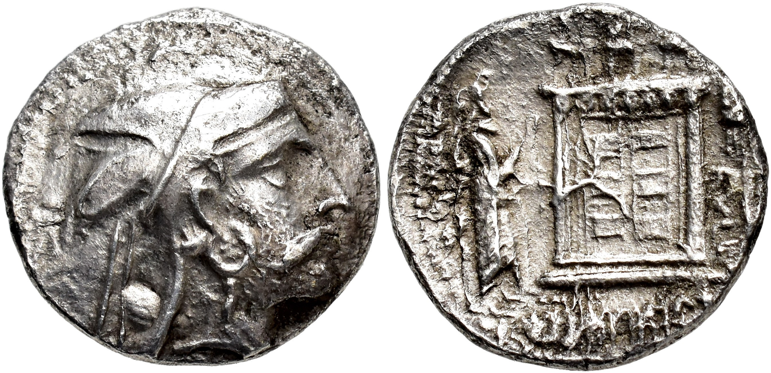GRECIA ANTIGUA. REINO DE PERSIS. Baydad. Dracma (S. III a.C.). A/ Cabeza del rey con kyrbasa a der. R/ El rey a der. delante de templo de Ahura Mazda; alrededor ley. en arameo. AR 4,01 g. 17,5 mm. Leves erosiones. EBC-. Rara.