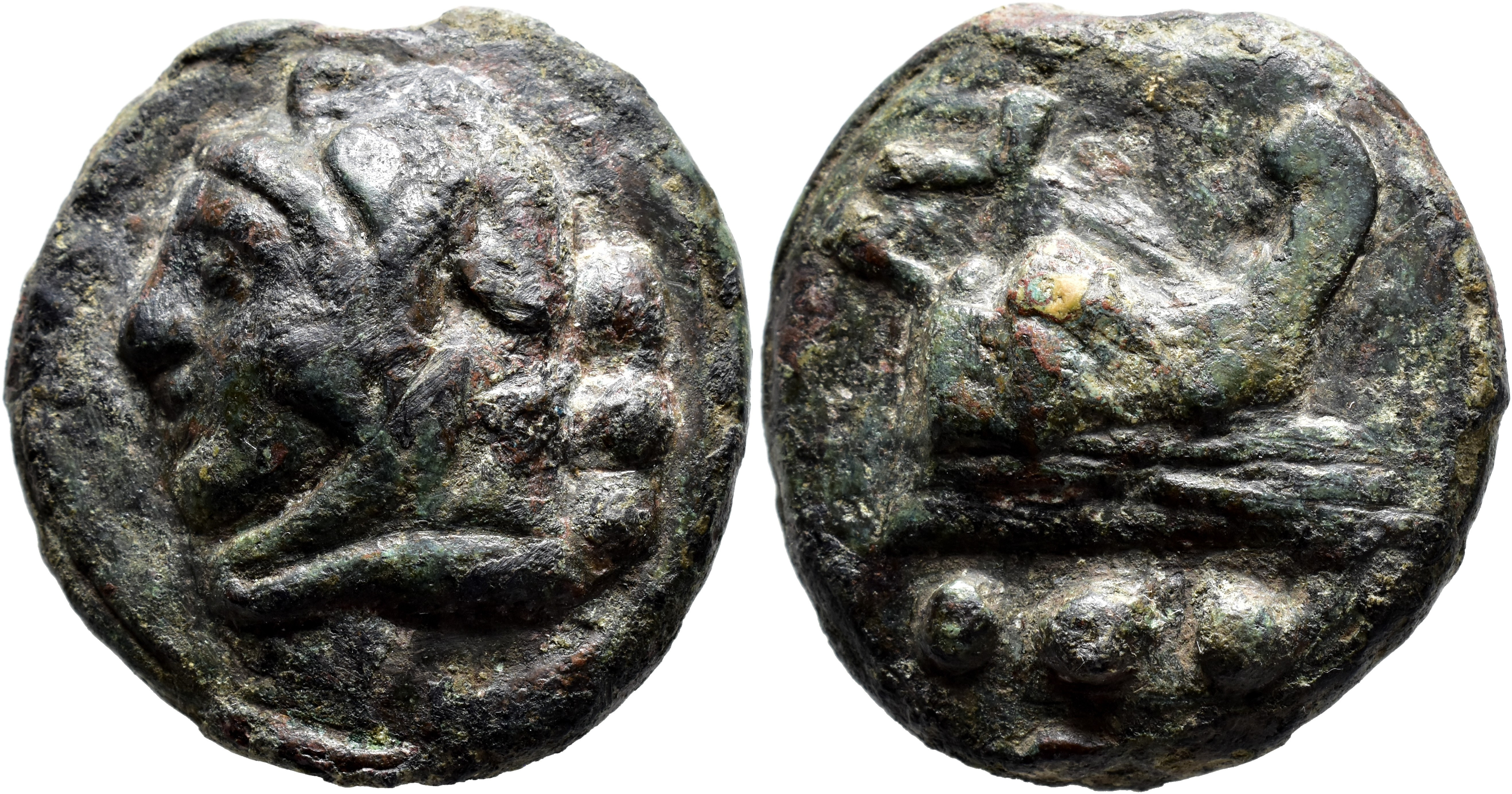 REPÚBLICA ROMANA. SERIES ANÓNIMAS. Quadrans. Roma (225-217 a.C.). A/ Cabeza de Hércules con leonté a izq., detrás 3 glóbulos. R/ Proa a der., debajo 3 glóbulos. AE 59,04 g. 35,9 mm. CRAW-35.4. Pátina verde. MBC/MBC-.
