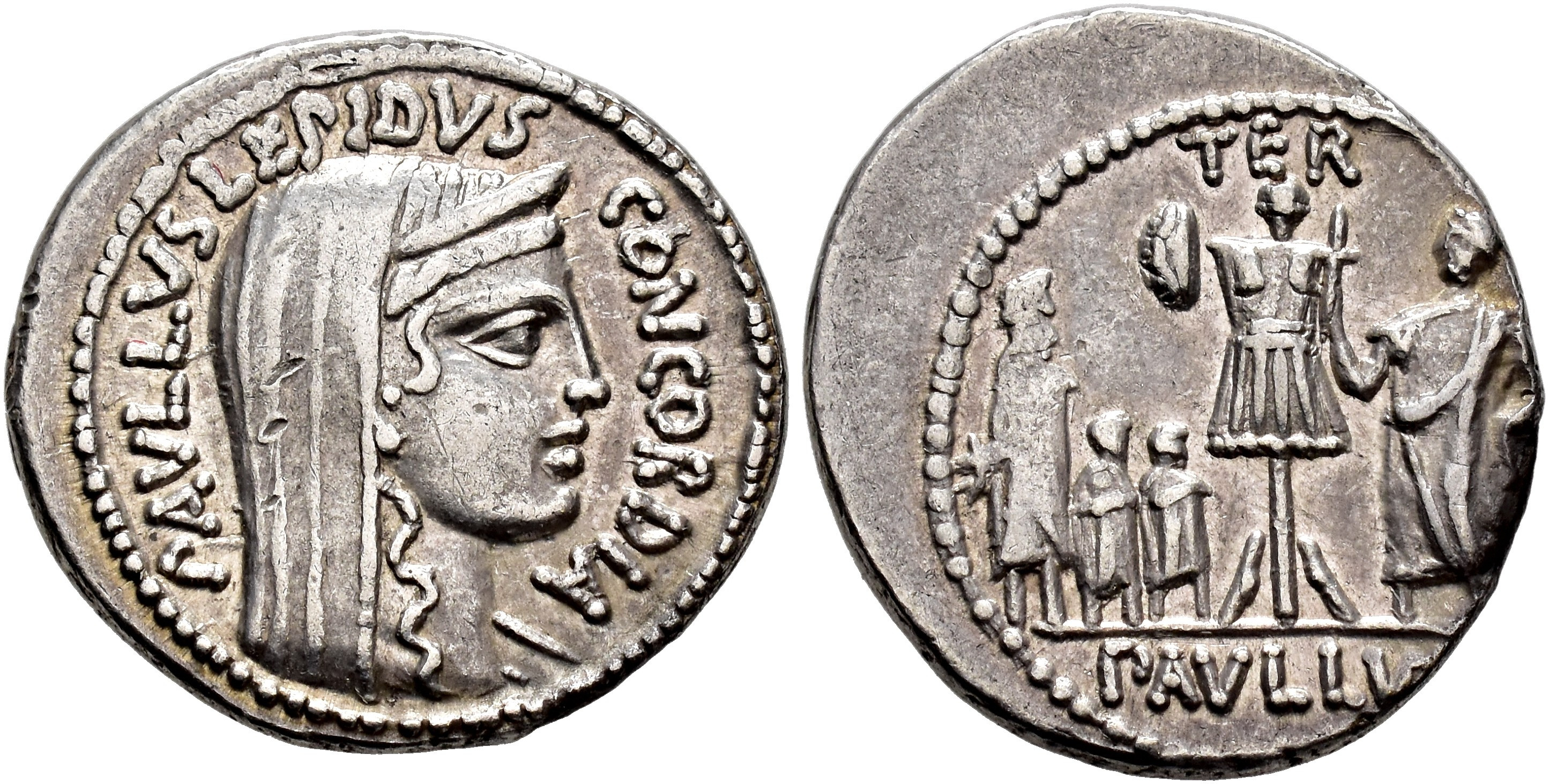 REPÚBLICA ROMANA. AEMILIA. Paullus Aemilius Lepidus. Denario. Roma (62 a.C.). A/ Cabeza velada y diademada de Concordia a der.; PAVLLVS LEPIDVS CONCORDIA. R/ L. Emilio Paulo junto a un trofeo, al otro lado Perseo de Macedonia cautivo con sus hijos; TER, en exergo PAVLLV(S). AR 4,02 g. 18,7 mm. CRAW-415.1; FFC-126. Rev. ligeramente descentrado. Pequeñas marcas. EBC-/MBC+.