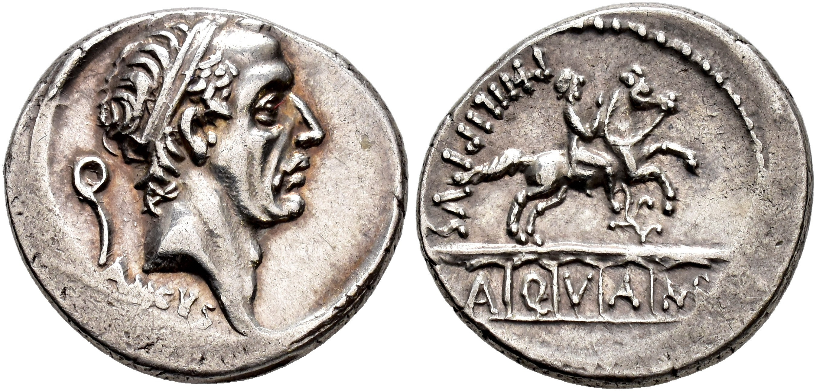 REPÚBLICA ROMANA. MARCIA. C. Marcius Philippus. Denario. Roma (56 a.C.). A/ Cabeza de Anco Marcio diademada a der., detrás lítuo; ANCVS. R/ Estatua ecuestre a der. sobre acueducto esquemático de 5 huecos en los que se lee AQVA MAR PHILIPPVS. AR 4,14 g. 17,3 mm. CRAW-425.1; FFC-894. Algo descentrada. EBC-.