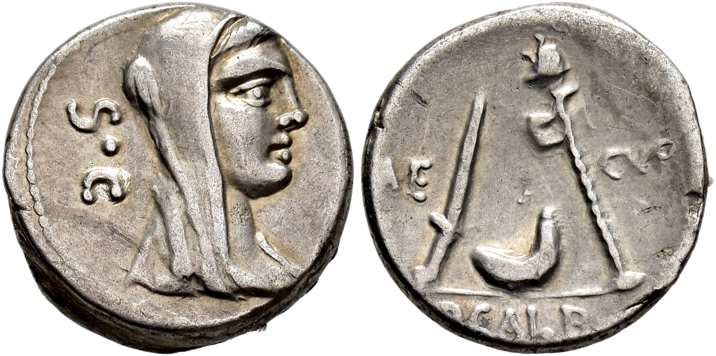 REPÚBLICA ROMANA. SULPICIA. P. Sulpicius Galba. Denario. Roma (69 a.C.). A/ Cabeza de Vesta a der., detrás S C. R/ Cuchillo, símpulo y hacha, en campo AE-CVR, exergo P GALB. AR 3,94 g. 16,2 mm. CRAW-406.1; FFC-1135. Pequeñas marcas. MBC+.