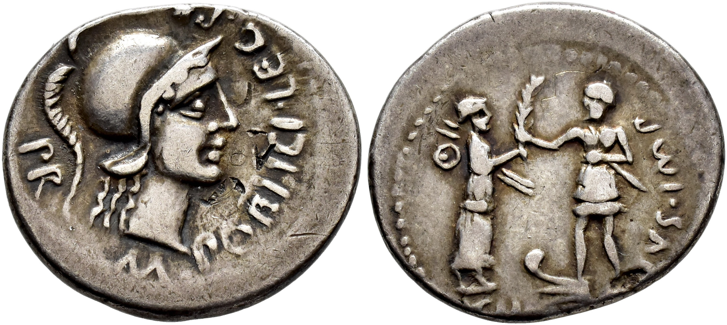 PERIODO DE JULIO CÉSAR A AUGUSTO. POMPEYO MAGNO. M. Poblicius, Denario. Hispania (46-45 a.C.). A/ Cabeza de Roma a der.; M POBLICI (LEG PRO) PR, gráfila de puntos y rayas. R/ Pompeyo sobre proa entregando una palma a la Bética, que porta escudo y dos jabalinas; (CN MAGN)VS IMP. AR 3,97 g. 18,6 mm. CRAW-469.a; FFC-1. Contramarcas en anv. MBC-.