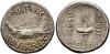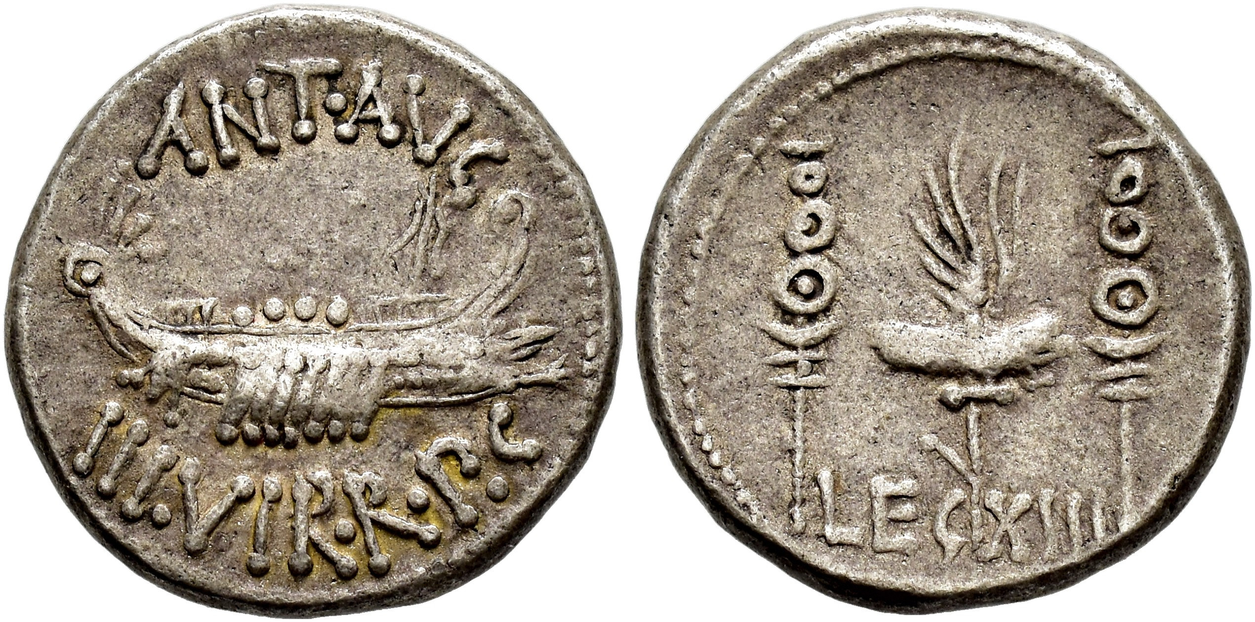 PERIODO DE JULIO CÉSAR A AUGUSTO. MARCO ANTONIO. Denario. Ceca móvil (32-31 a.C.). A/ Galera a der.; ANT. AVG III VIR R P C. R/ Aquila entre dos signa; LEG- XIII. AR 3,75 g. 17,3 mm. CRAW-544.27; FFC-47. MBC.
