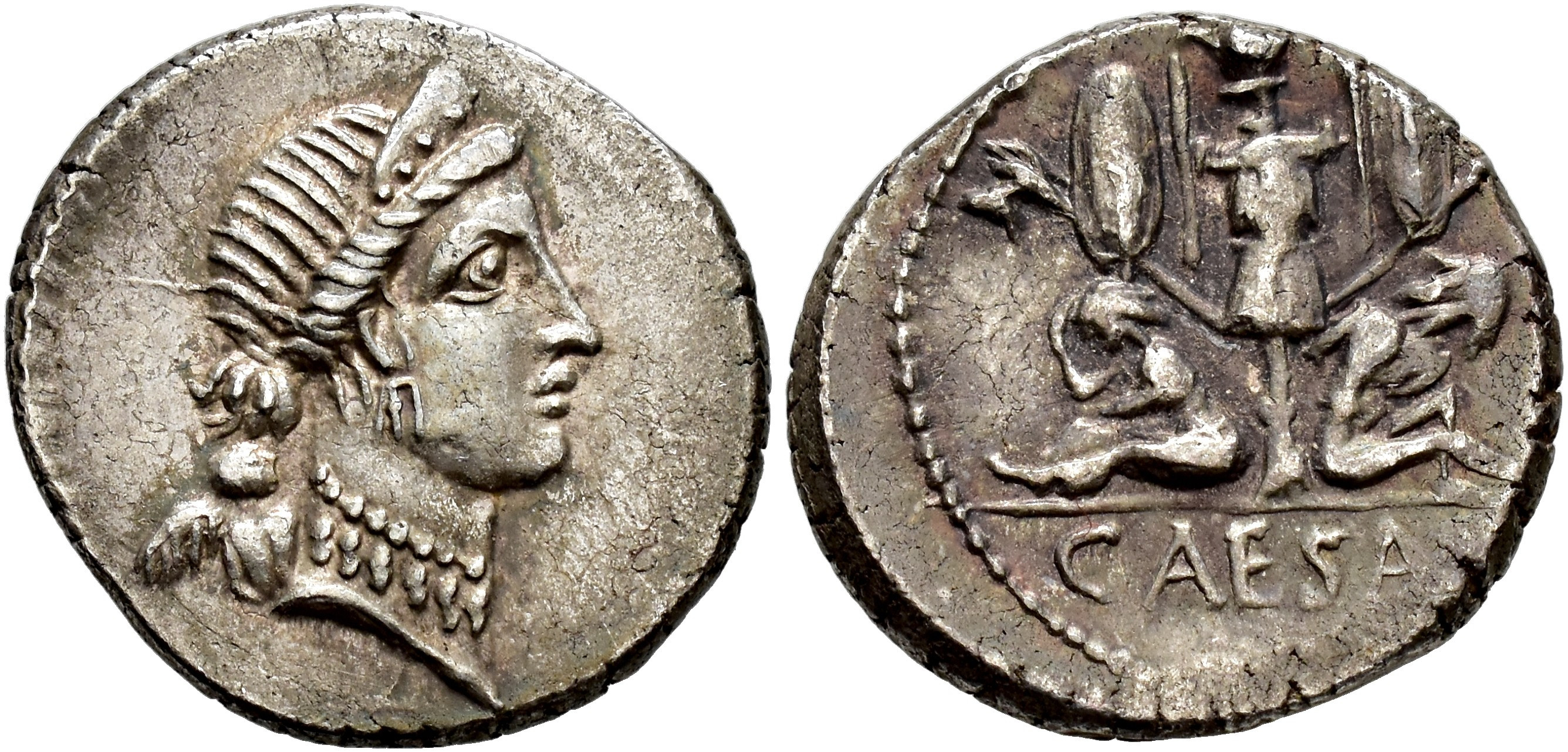 PERIODO DE JULIO CÉSAR A AUGUSTO. JULIO CÉSAR. Denario. Galia. Ceca móvil (46-45 a.C.). A/ Cabeza de Venus a der., detrás Cupido. R/ Trofeo flanqueado por dos cautivos (¿Galia y Vercingetorix?), exergo CAESAR. AR 3,96 g. 17,3 mm. CRAW-468.1; FFC-11. MBC+.