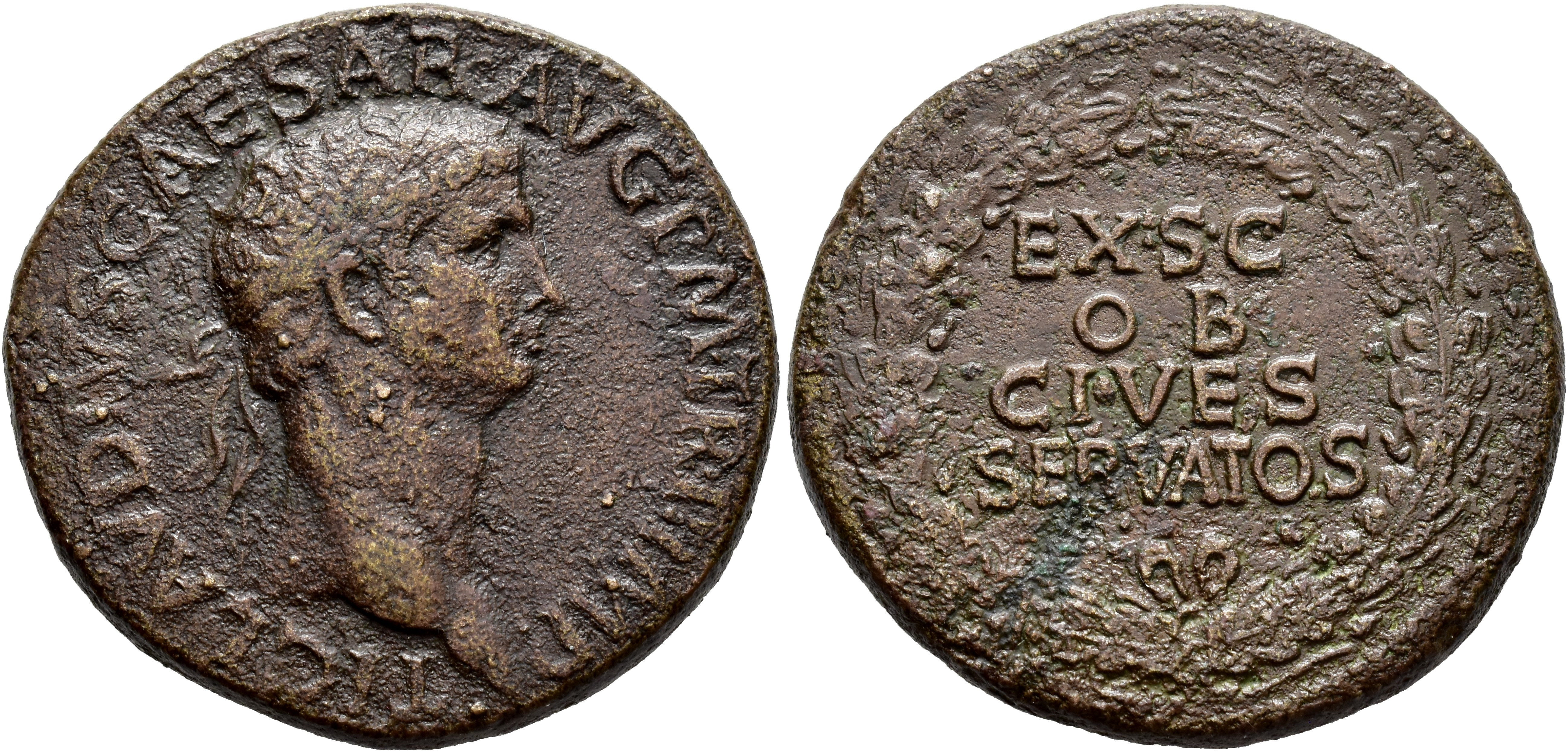 IMPERIO ROMANO. CLAUDIO I (41-54 d.C.). Sestercio. Roma (41-50 d.C.). A/ Cabeza laureada a der.; TI CLAVDIVS CAESAR AVG P M TR P IMP. R/ Láurea rodeando EX S C/ OB / CIVES/ SERVATOS. AE 28,34 g. 34 mm. RIC-96. Superficies erosionadas. MBC/MBC+.