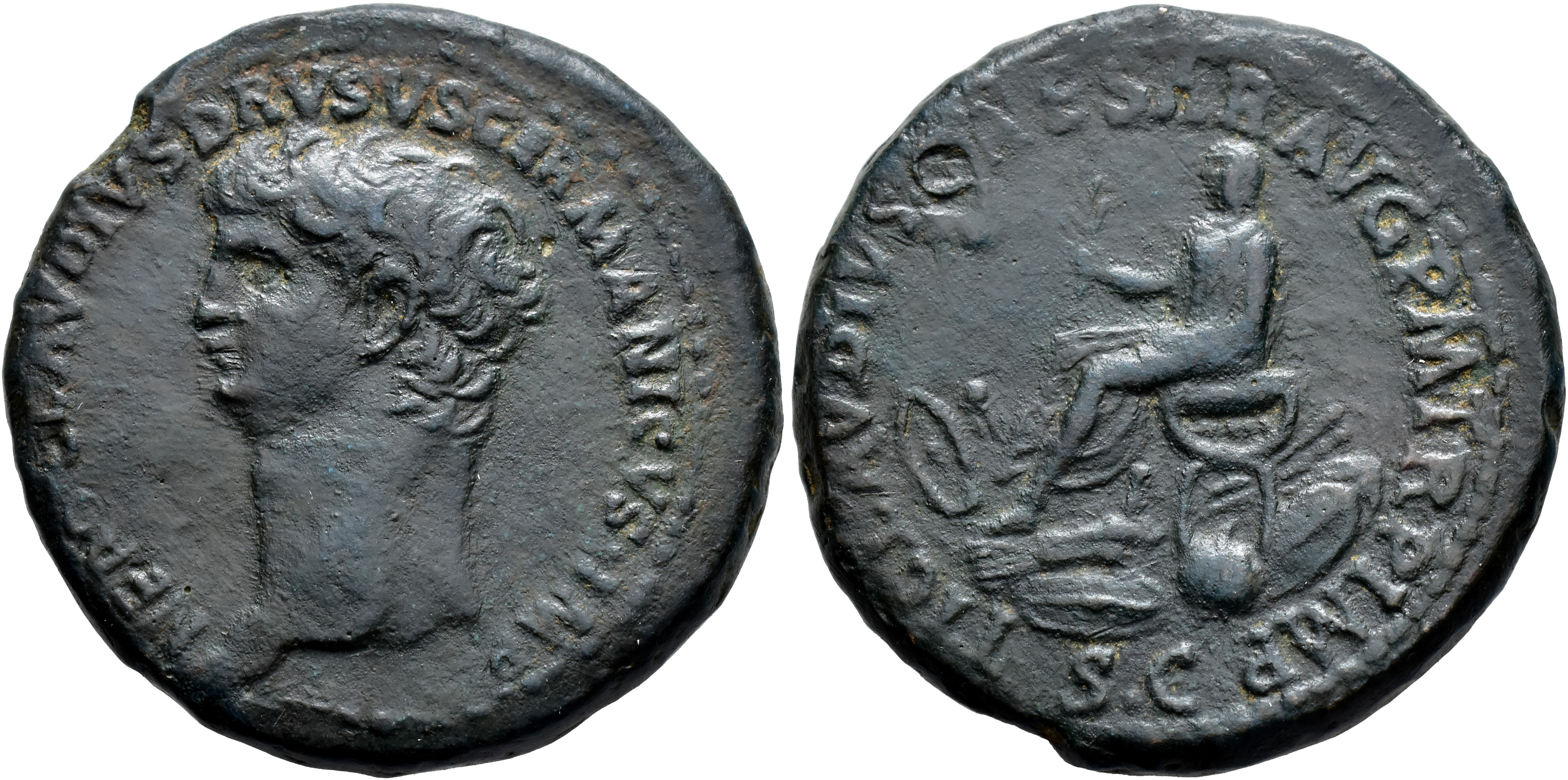 IMPERIO ROMANO. DRUSO EL MAYOR. Sestercio. Roma (41-50 d.C.). A/ Cabeza a izq.; NERO CLAVDIVS DRVSVS GERMANICVS IMP. R/ Claudio togado sentado en silla curul a izq. con rama y armas alrededor; TI CLAVDIVS CAESAR AVG P M TR P IMP, S C. AE 26,94 g. 35,8 mm. RIC-93. Pátina verde oscuro. MBC-.