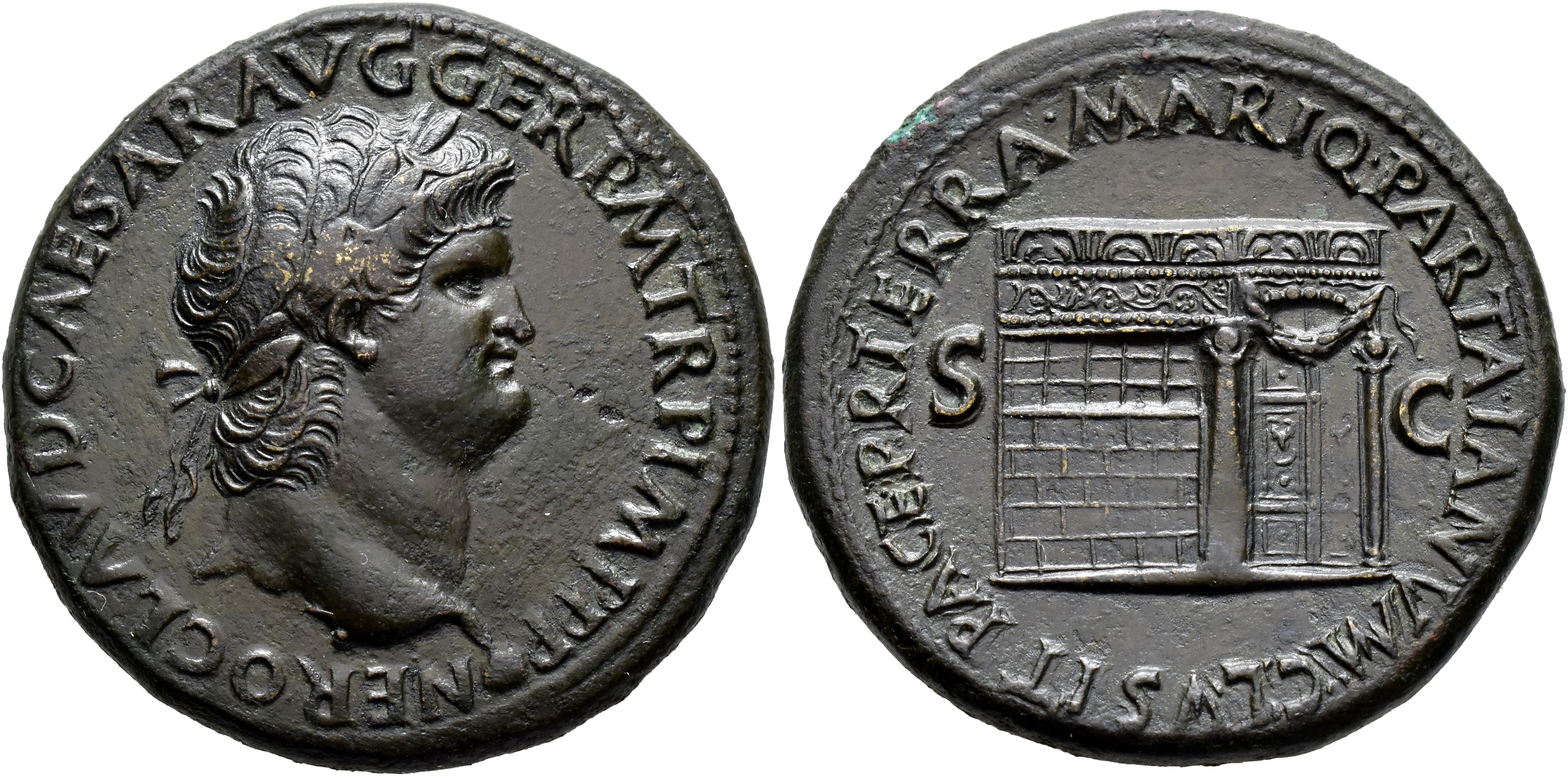 Nerón (53-68) ordenó acuñar una emblemática serie de sestercios que muestran el Templo de Jano con las puertas cerradas. Templo antiquísimo con gran raigambre popular situado en el Foro, junto a la Basílica Emilia, el cierre de sus puertas significaba que Roma estaba totalmente en paz, algo muy raro, las fuentes hablan de que las puertas fueran cerradas por el rey Numa Pompilio, por Aulo Manlio Torquato al finalizar la Primera Guerra Púnica y luego por el emperador Augusto (en tres ocasiones). Tras diversos problemas sociales y políticos, como el famoso incendio de Roma del 64, se dice que tras visitar Roma el rey Tiridates de Armenia, que aceptó ser coronado por Nerón, éste ordenó el cierre de las puertas del Templo de Jano como muestra del poder imperial, y para conmemorarlo se hizo esta emisión monetaria tan característica y bella.