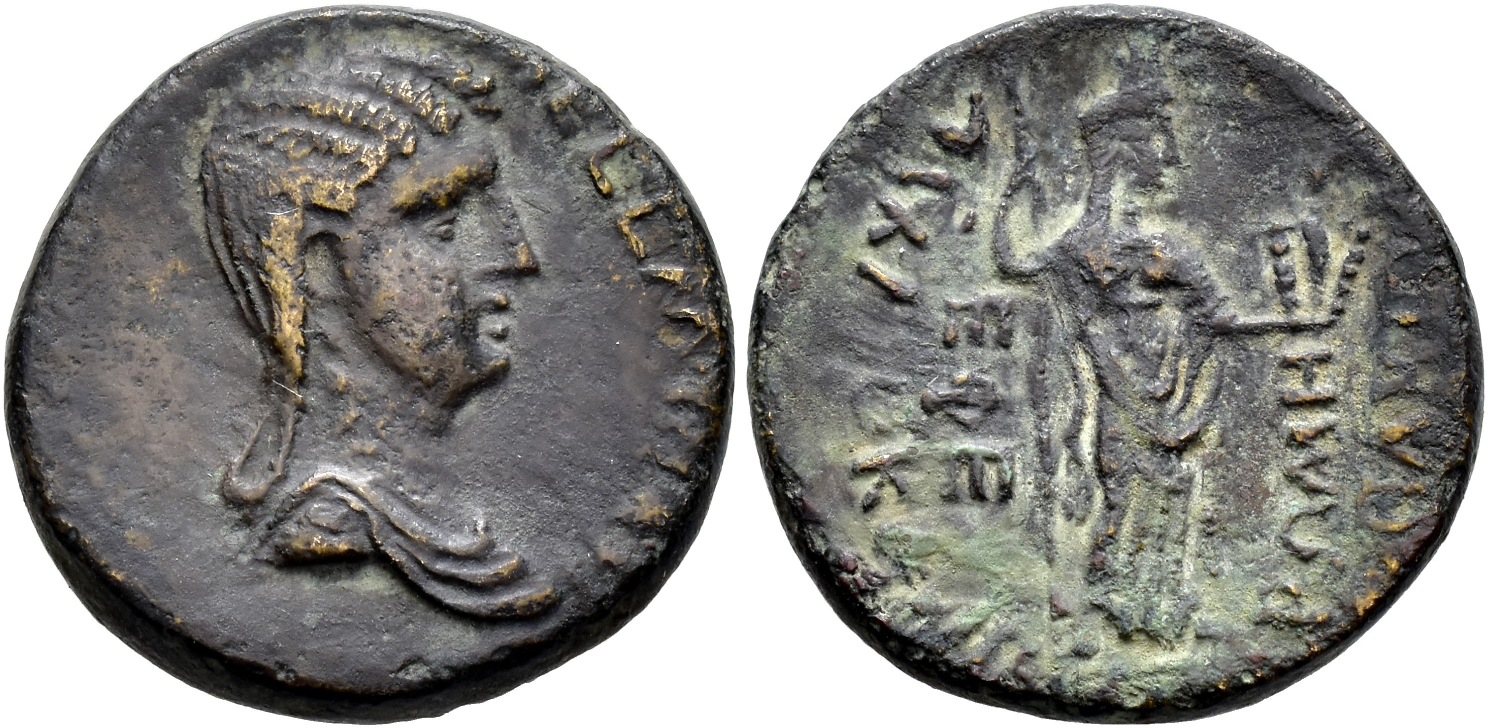 IMPERIO ROMANO. MESALINA. AE 20. Éfeso (65-66 d.C.). A/ Busto drapeado a der. R/ Roma como Isis-Tyche a der. con cetro y escultura de Ártemis. AE 6,24 g. 20,2 mm. RPC-I.2632. MBC. Rara.