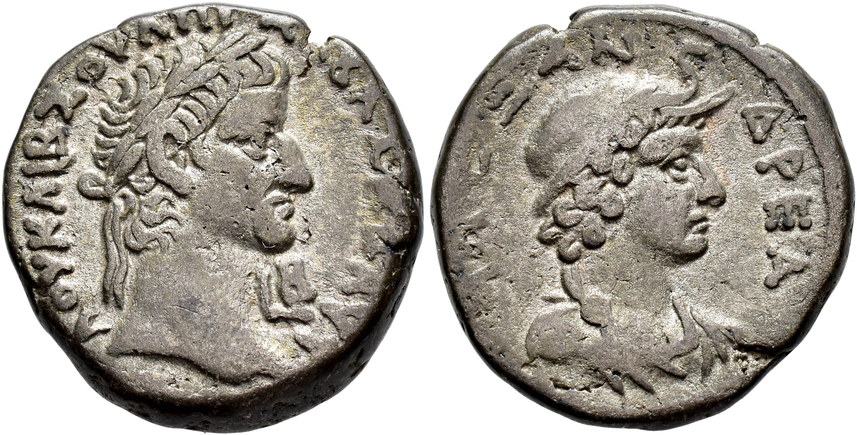 IMPERIO ROMANO. GALBA (68-69 d.C.). Tetradracma. Alejandría (68-69 d.C.). A/ Cabeza laureada a der., detrás L B (año 2). R/ Busto de Alejandría a der. con exuviae elephantis. VE 12,89 g. 25 mm. RPC-I.5331. MBC.