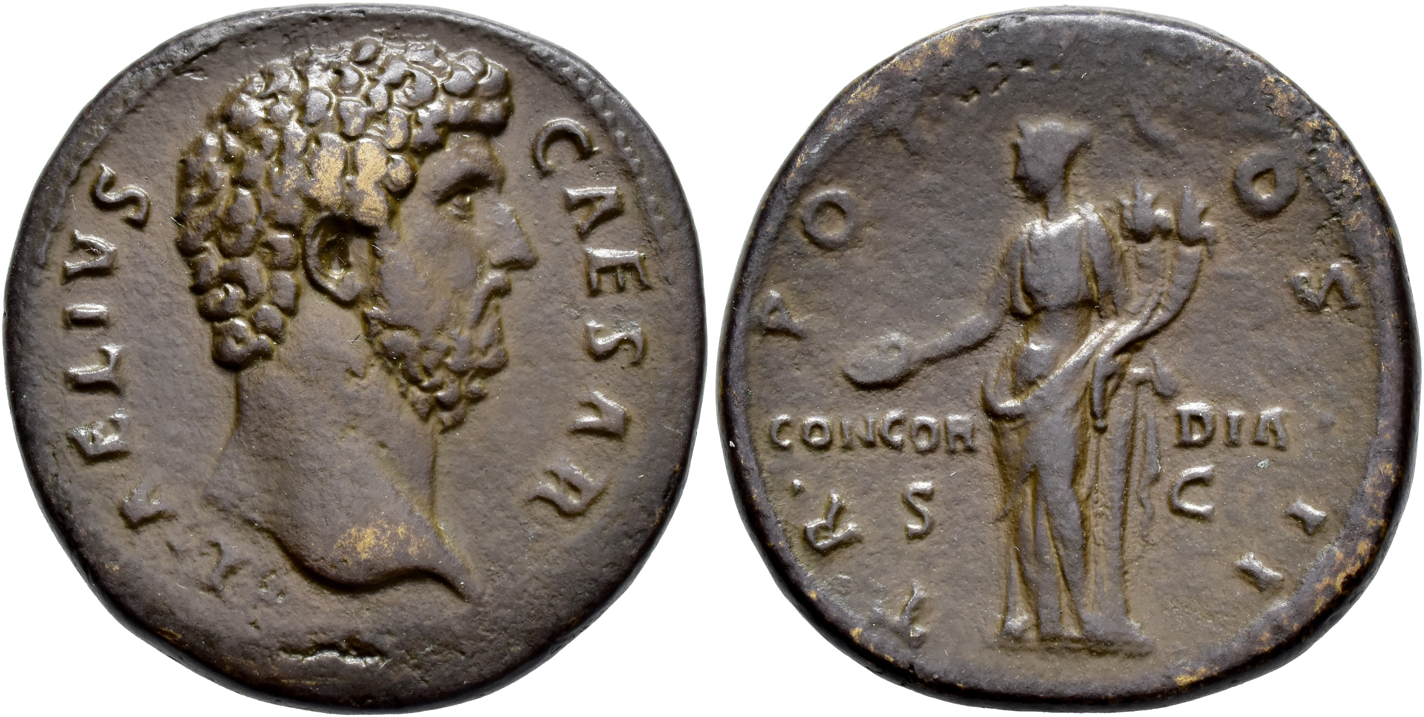 IMPERIO ROMANO. LUCIO ELIO (137-138). Sestercio. Roma (137). A/ Cabeza a der.; L AELIVS CAESAR. R/ Concordia a izq. con pátera y cornucopia; TR POT COS II, CONCORDIA/ S-C. AE 23,02 g. 32,8 mm. RIC-2655. Pátina marrón. MBC/MBC-.