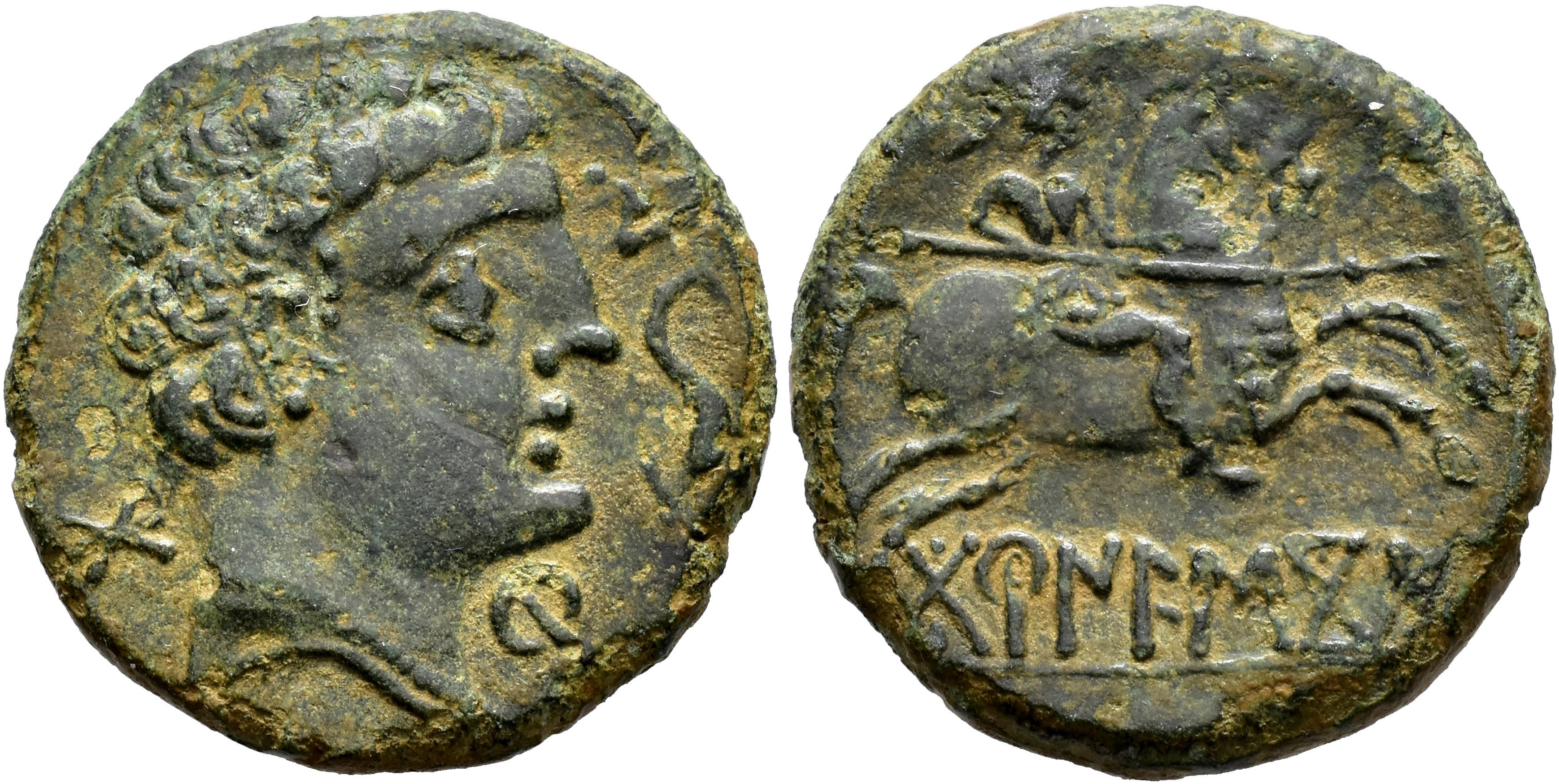 HISPANIA ANTIGUA. BORNESKON. Unidad. A/ Cabeza masculina a der., delante R, delfín y N, detrás Bo. R/ Jinete lancero a der., debajo sobre línea BoRNESKoN. AE 8,16 g. 23,2 mm. I-294; ACIP-1587. Pátina verde oscuro. MBC+. Rara.