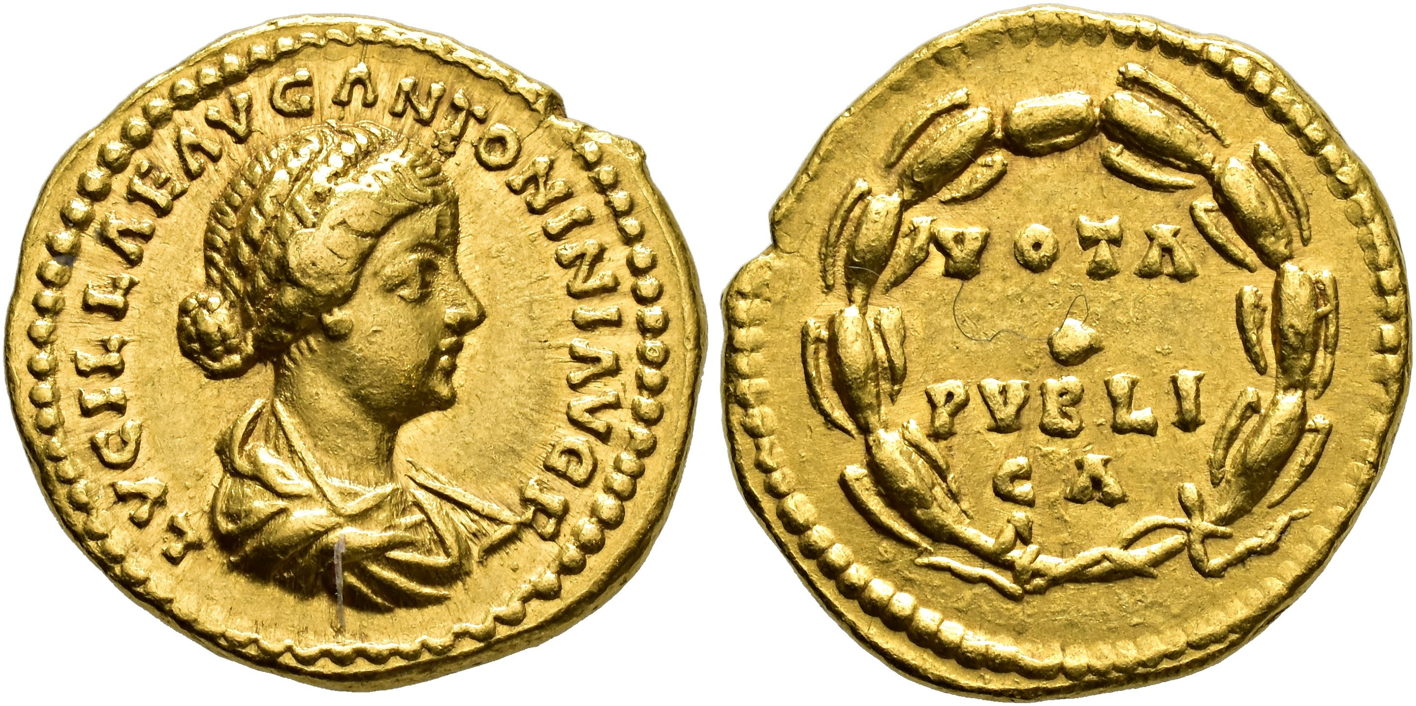 Lucila (149-182), hija del emperador Marco Aurelio y Faustina la Menor, hija de Antonino Pío. En 164 su padre la casó con su hermano de adopción y coemperador Lucio Vero (m.169) y tras su muerte lo hizo con un destacado político y militar, Tiberio Claudio Pompeyano Quintiano (m.182). Tras la subida al trono de su hermano Cómodo (180) conspiró contra él y fue desterrada a Capri (182) donde fue asesinada por orden del emperador. Este áureo la muestra con el título de Augusta, que recibió tras su matrimonio con Vero, el reverso con VOTA PUBLICA lo tenemos en piezas de oro, plata y bronce que se realizaron precisamente para conmemorar el enlace matrimonial de Lucila y Vero