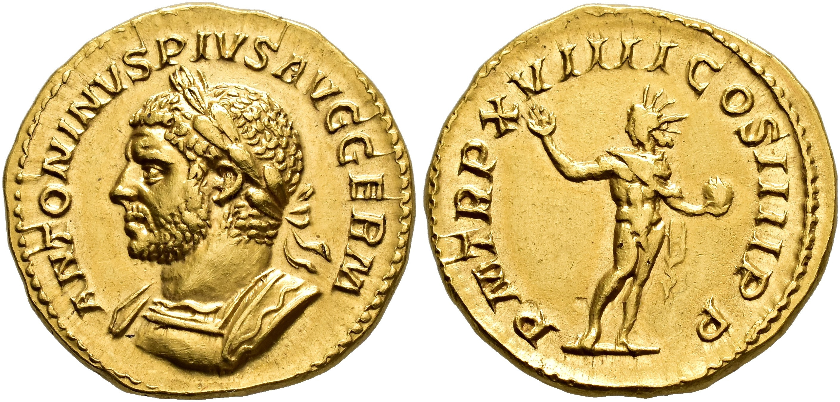 IMPERIO ROMANO. CARACALLA (211-217). Áureo. Roma (216). A/ Busto laureado y acorazado a izq.; ANTONINVS PIVS AVG GERM. R/ Sol mirando a izq.; P M TR P XVIIII COS IIII P P. AU 6,34 g. 18,6 mm. RIC-281C, Cal.-2747. EBC/MBC+. Rara.
