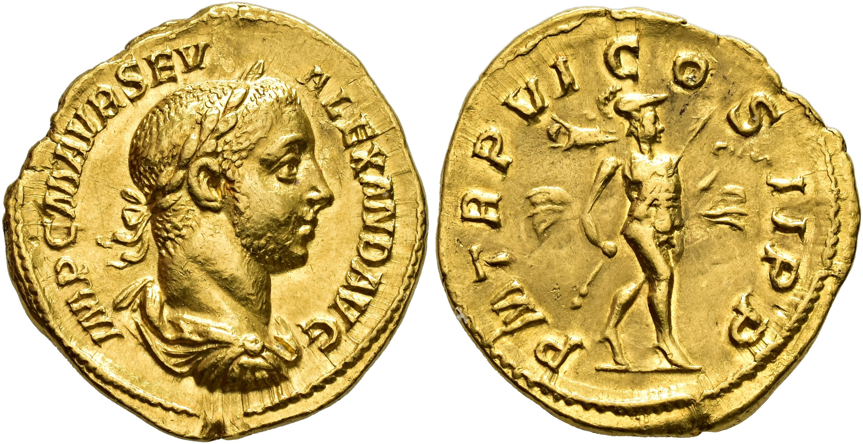 IMPERIO ROMANO. ALEJANDRO SEVERO (222-235). Áureo. Roma (227). A/ Busto laureado, drapeado y acorazado a der.; IMP C M AVR SEV ALEXAND AVG. R/ Marte avanzando a der. con lanza y trofeo; P M TR P VI COS II P P. AU 5,91 g. 21,3 mm. RIC-60d; Cal.-3112. EBC/EBC-. Muy escasa.