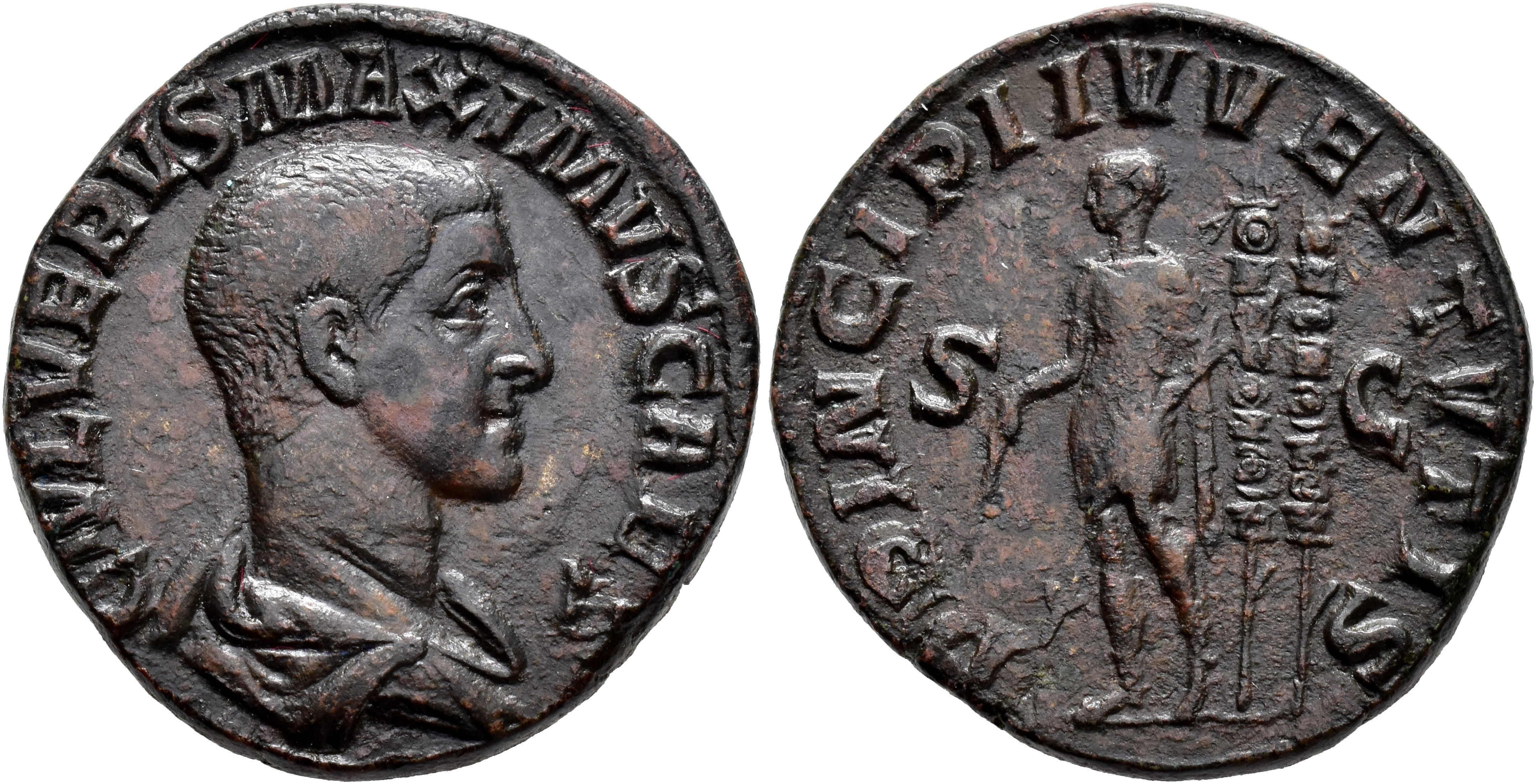 IMPERIO ROMANO. MÁXIMO (235-238). Sestercio. Roma (236-238). A/ Cabeza drapeada a der.; C IVL VERVS MAXIMVS CAES. R/ Máximo con dos estandartes y bastón; PRINCIPI IVVENTVTIS, S-C. AE 17,99 g. 30,1 mm. RIC-9. Pátina oscura. MBC+/MBC.
