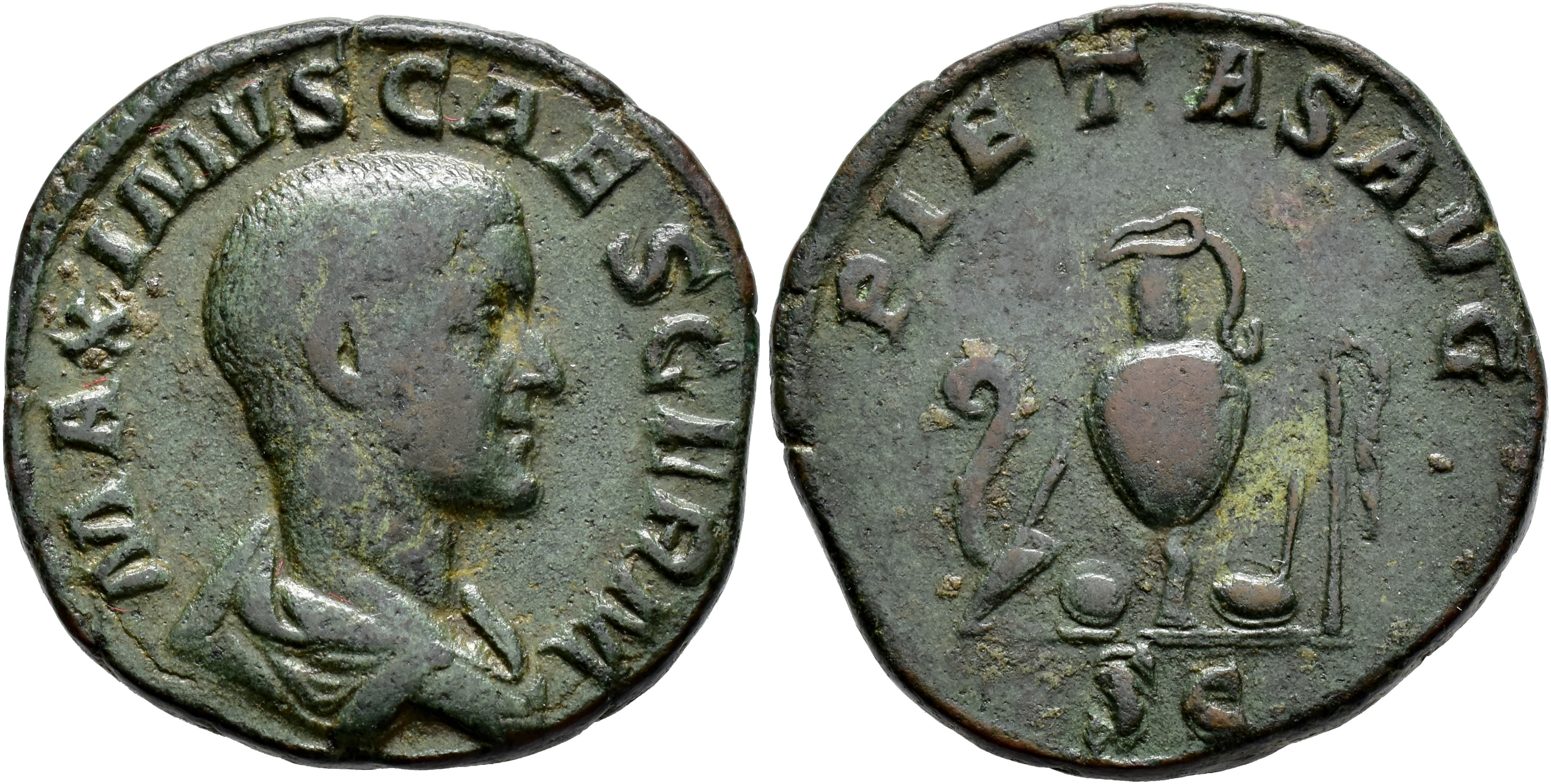 IMPERIO ROMANO. MÁXIMO (235-238). Sestercio. Roma (238). A/ Cabeza drapeada a der.; MAXIMVS CAES GERM. R/ Instrumentos sacerdotales; PIETAS AVG, S C. AE 17,77 g. 29,6 mm. RIC-11. Pátina verde. MBC-.